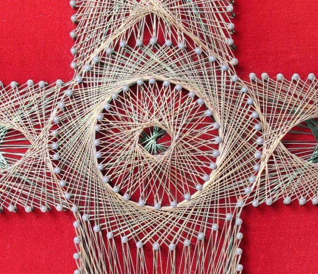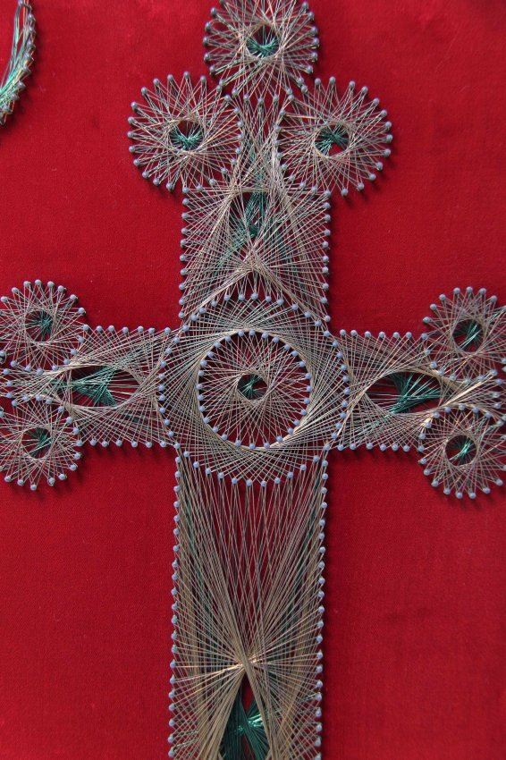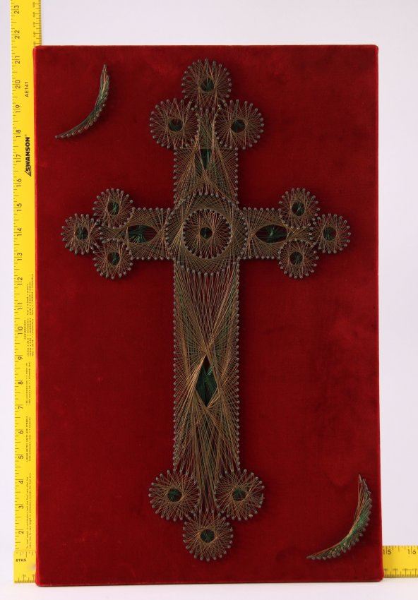 Exquisite steel-strung wire-art depicting the cross of Christ between two new moons. SIZE: see attached ruler photo. Photos are part of the description representing the condition report and can be used for authentication prior to the sale date. Pangaea Auctions urges Bidder's to view all attached photos in detail. #(American, 19th-20th Century, Decorative Art, Canvas, Steel, Vintage, Italian, European, ).