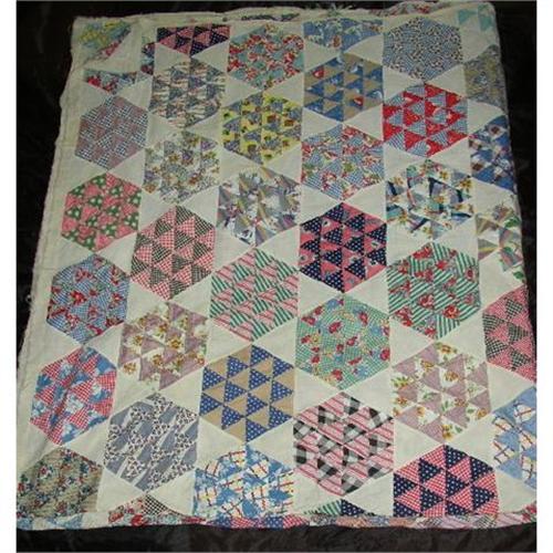 Exquisite, pristine, handstitched quilt top. Sugar sack Triangles sewn into Hexagons. A one in a million find! </em></td>