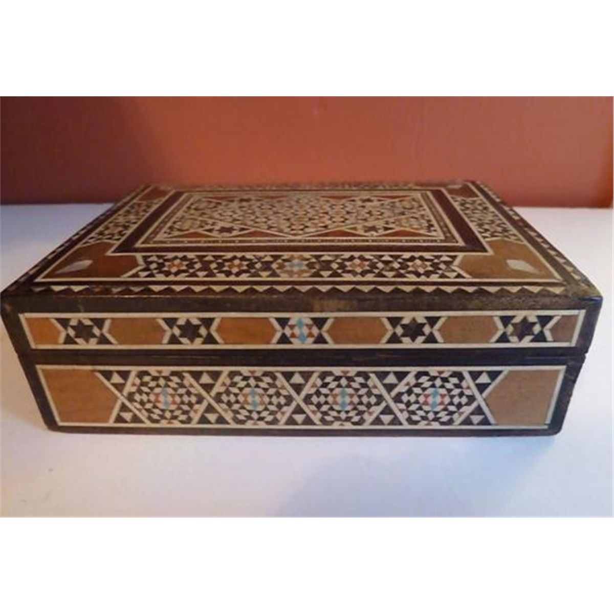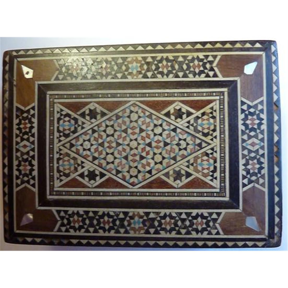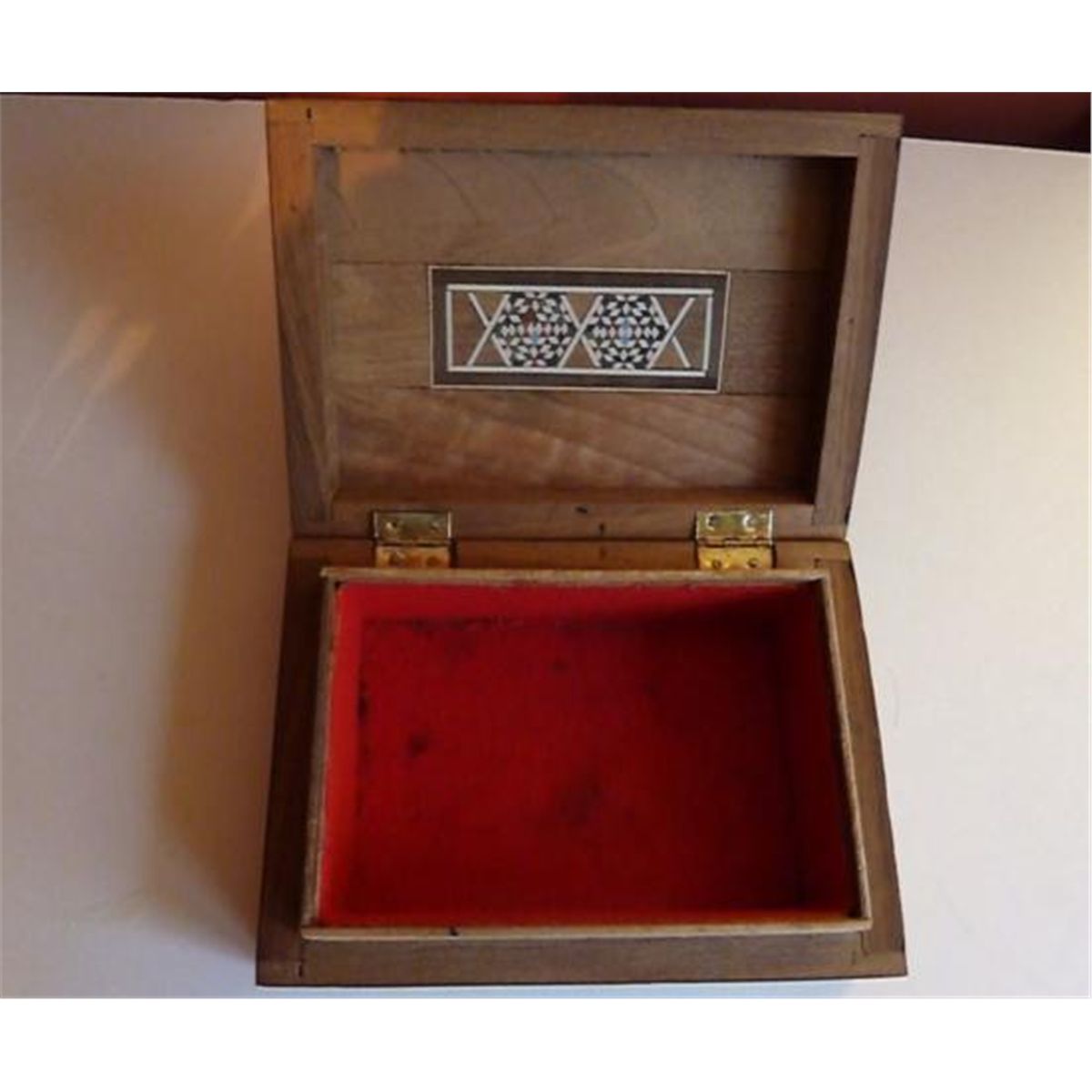 Exquisitely detailed INLAID Mother of Pearl JEWELRY BOX with Red velvet lined interior. Dimensions 6~5/8 L x 4~3/4 W x 2~ H MWF1131