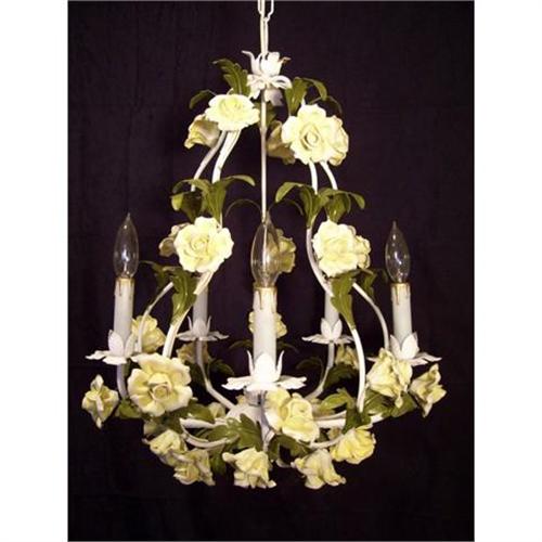 We are pleased to offer one of the best Tole fixtures we've ever had. This Mid Century Italian chandelier looks like new! This has 30 Stunning large 3" soft yellow porcelain roses with soft green tole leaves on a white finished cage frame. There are 5 lights on five arms. This beauty measures 24" tall and 20" wide. There is about 8" of matching chain with the original ceiling canopy. This does have the authentic metal tag at the top stamped: MADE IN ITALY. The condition is excellent! There may be a chip on the roses here or there which is common in these, But I did not find any. The finish looks new, extremely minimal chips in the paint if any. You will be impressed with the condition of this! it is just gorgeous!