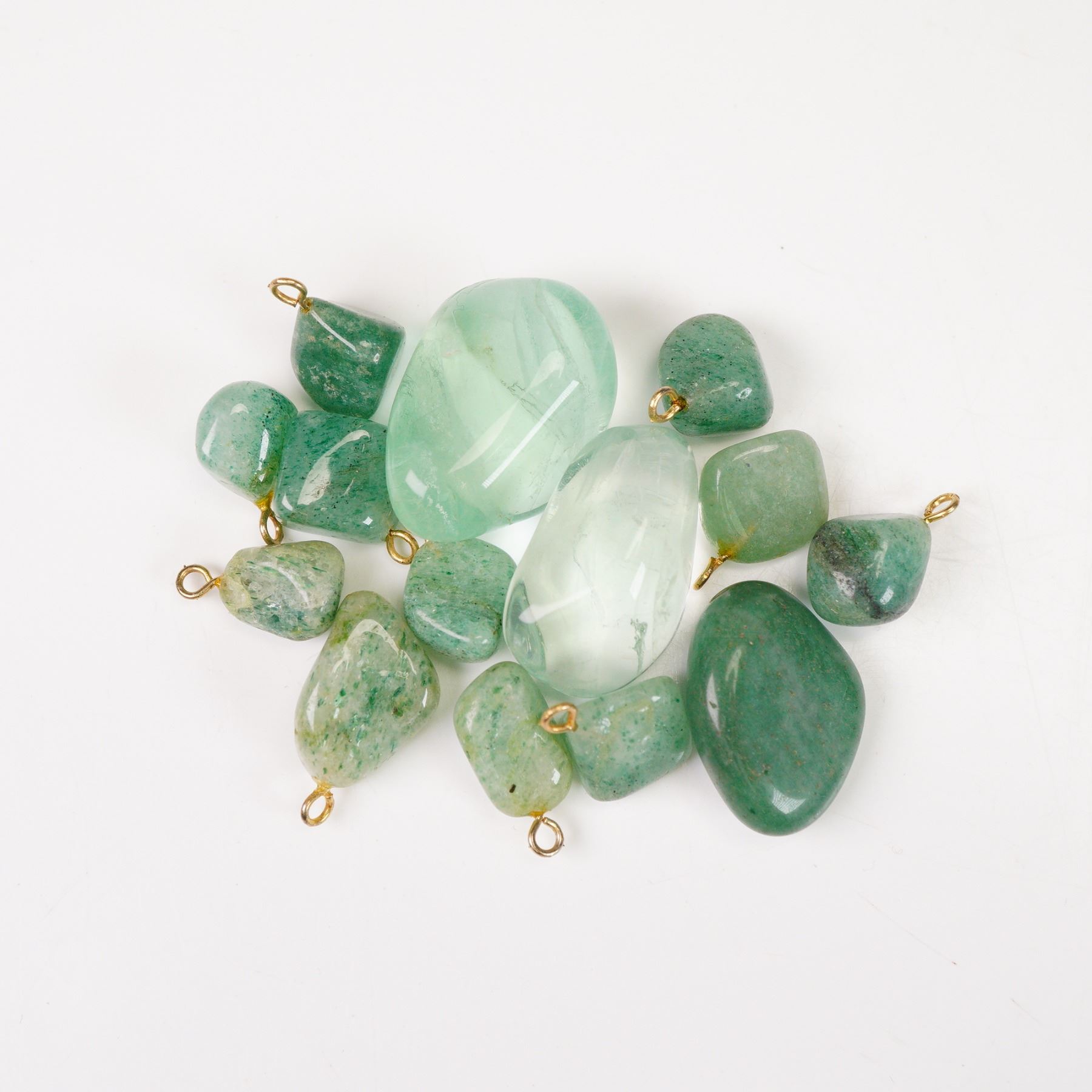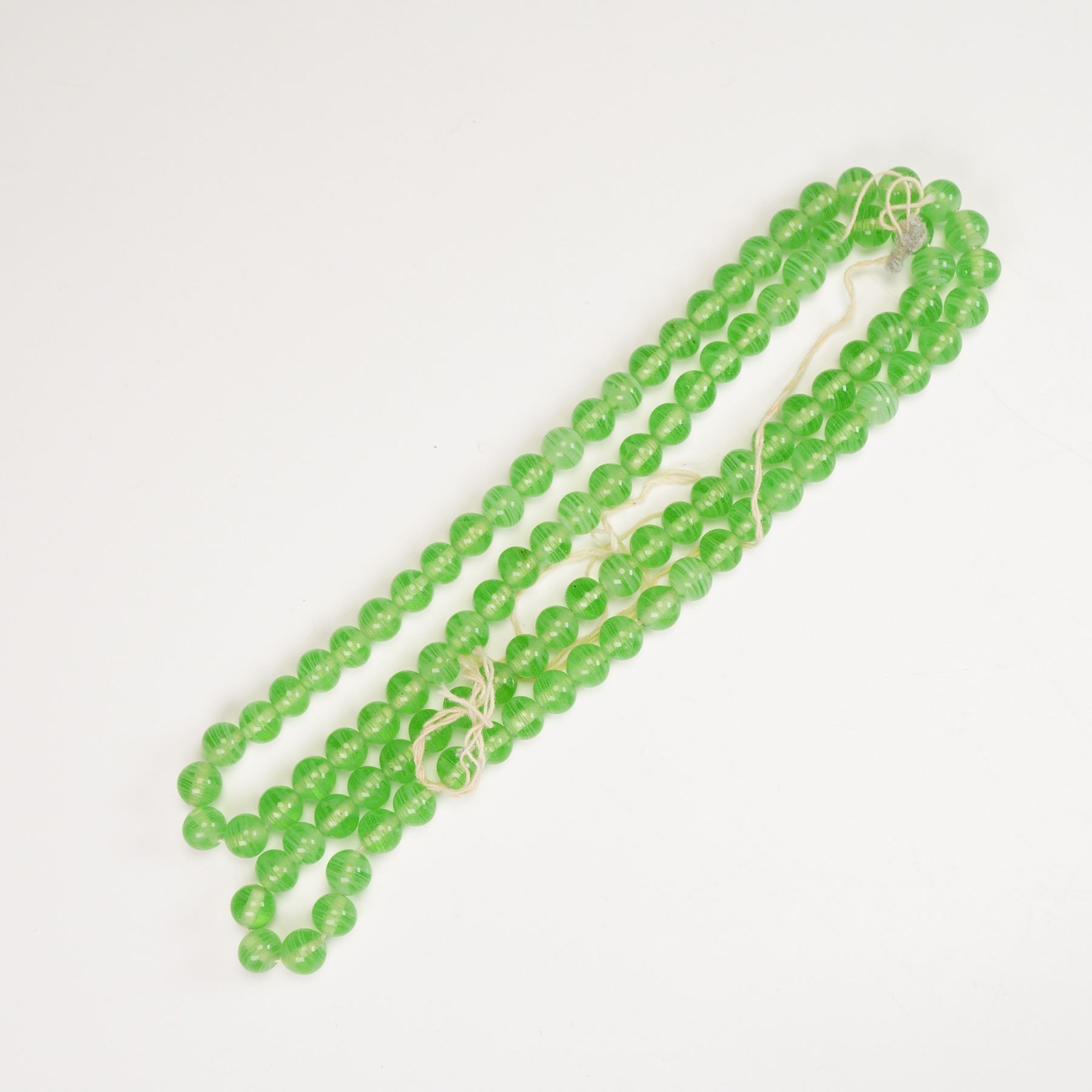 A comprehensive assemblage of various craft materials comprising approximately 54 bags of strands of metallic beads, glass and resin pieces, carved green and amber-tone ornaments, and shell pendants with cord necklaces. A diverse selection suitable for jewelry making, repair, or creative design projects.