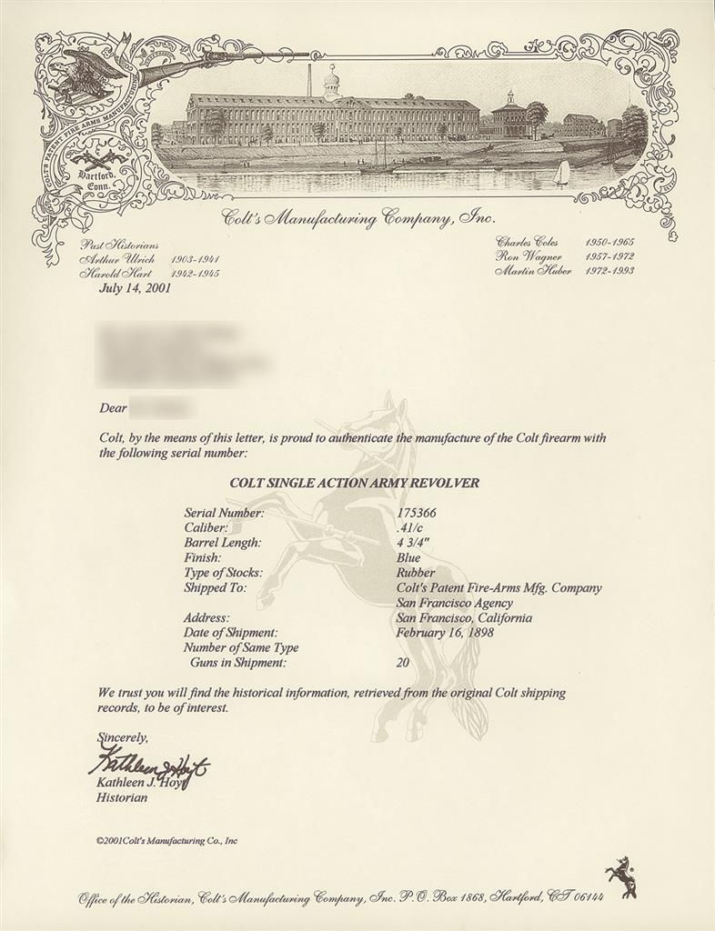 Manufactured in 1898. The factory letter states it is a 41 caliber with a 4 3/4 inch barrel, is blue, has rubber stocks and was shipped to Colt's Patent Fire-Arms Mfg. Co. San Francisco Agency on February 16th, 1898.