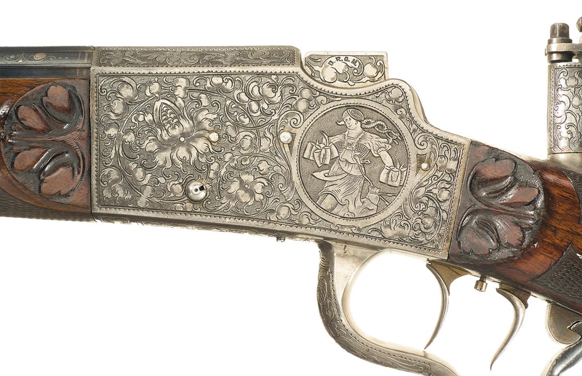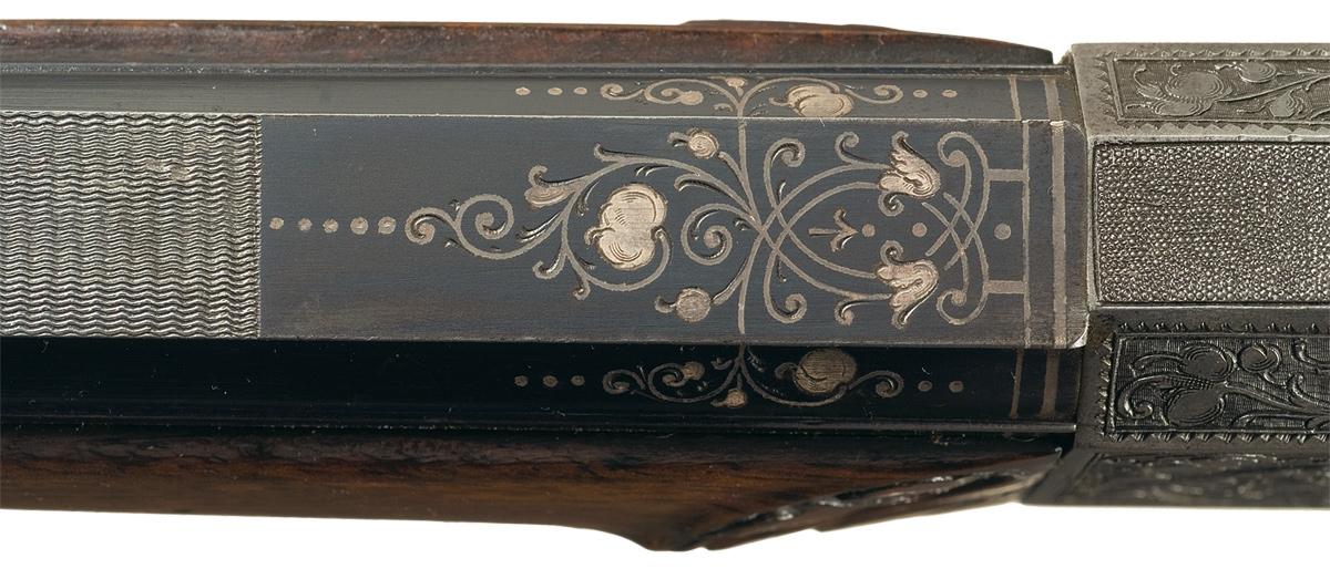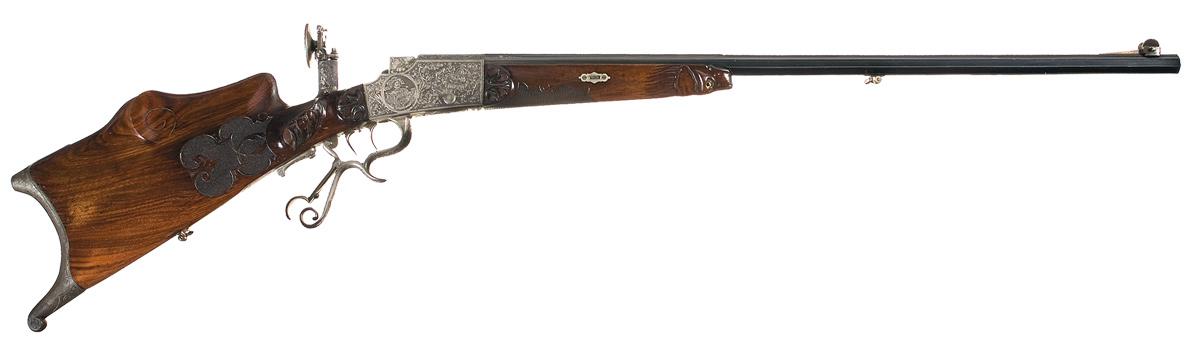 Adjustable ramp blade front sight, with the textured quarter rib expanding at the rear 10" of the barrel, thin ribs running along the edges, and silver scroll and floral inlay at the breech. Falling block receiver, with a detachable double set trigger, finger rest trigger guard/ lever with claw latch, "D.R.G.M." stamped on the left side of the block, and a fully adjustable tang mounted peep sight. Near full coverage scroll and floral engraving on the frame, with a bearded face on the trigger guard, matching pattern on the sight, a circular scene of a beer maid (Schuetzenliesl) on the left and a man with rifle and stein on the reverse. Finely carved straight wrist stock, with a carved dog's head with glass eyes on the forearm tip, raised floral designs around the receiver, checkered forearm and wrist, Tyrolean-style buttstock with Fleur-de-Lis carvings, raised contoured comb and cheekpiece, engraved buttplate with hook and a floral bordered deep carved scene of a hunter afield, with slung rifle and beer stein.