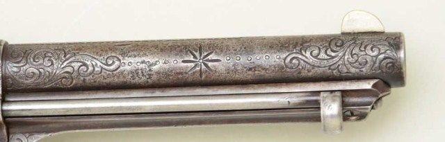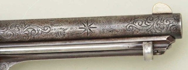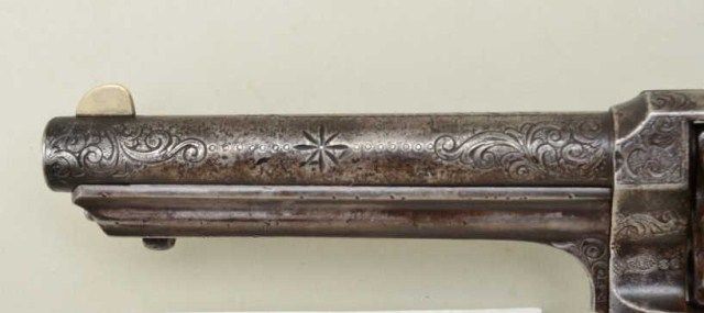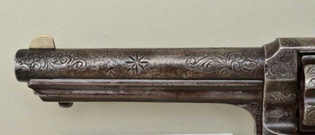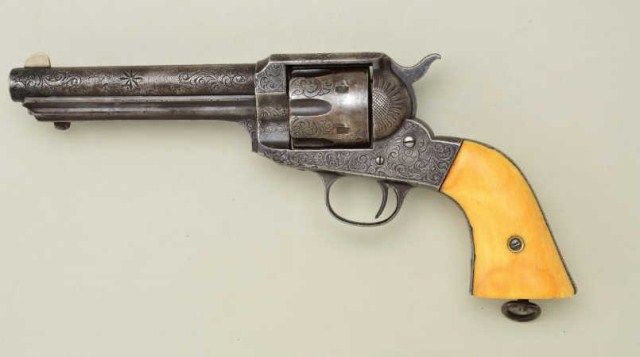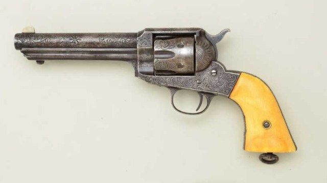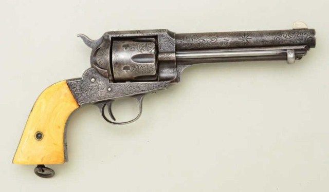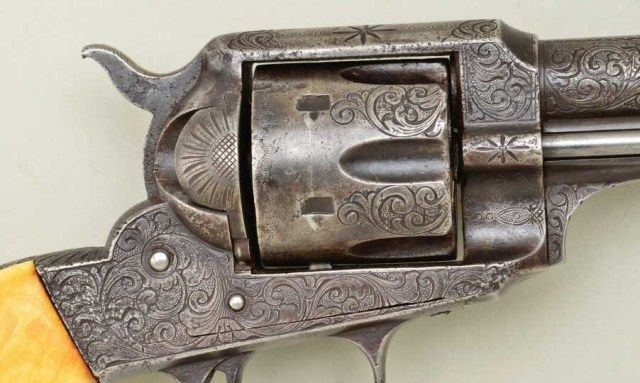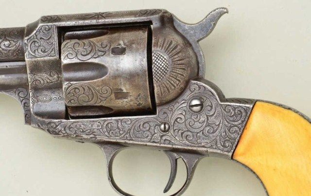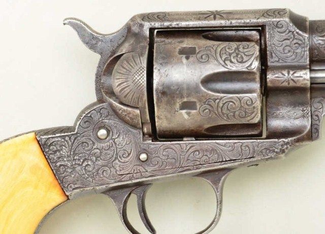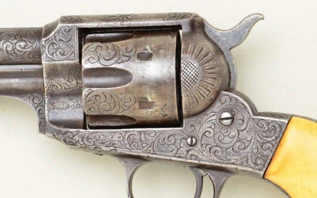 Extensively period engraved Remington Model 1890 Single Action revolver, .44 cal., 5-1/2” barrel, blue finish, period ivory grips, lanyard ring, #1214. This gun is in overall good to very good condition showing a darkuncleaned patina on metal surfaces with some scattered areas of erosion and pitting, very good action, dark bore, beautiful engraving throughout the gun; grips are overall very good with a beautiful patina and fit nicely,definitely period with age checkering at butt and a small old loss at the butt of the right grip at frame pin. The Model 1890 was the successor to the Model 1875 Army and is very desirable to Remington and Old Westcollectors having only been in production from 1891-1896 with approx. 2,000 manufactured; very hard to find anywhere and this one is engraved! Est.: $4,500-$8,500.
