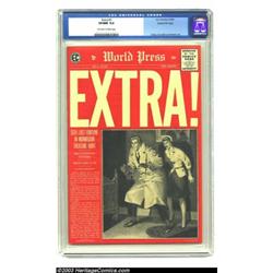 Extra! #2 Gaines File pedigree 1/12 (EC, 1955) CGC VF/NM 9.0 Off-white to white pages. EC was making every attempt to maintain their readership by 1955. All of the famous artists were still there, and Johnny Craig, Reed Crandall and John Severin worked on this particular issue. Yet these Code-approved issues must not have packed quite enough punch for the readers to continue to purchase them in enough quantity to maintain their publication. Overstreet 2003 NM 9.4 value = $165. Important notice: Heritage usually auctions material at the rate of 200-250 lots per hour. On some occasions eBay Live bid software or the Internet may not be able to keep up with the pace of the auction. We recommend placing a realistic absentee bid now as insurance to avoid disappointment. Occasionally the auctioneer may eliminate or reject an eBay Live bid, and the auctioneer may also reopen a lot after the close of the eBay live bidding (usually because we missed an audience bid), and may reject your bid even if it shows you as the winning bidder. By bidding via eBay Live, you agree that Heritage may award the lot to another bidder at its sole discretion under the circumstances described above or any other reasonable circumstances. Also please note that all Heritage lots purchased through eBay Live carry a 20% Buyer's Premium. Please make sure you read the Terms and Conditions before you bid.