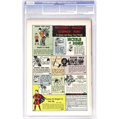 48C. COMICS – Comic books sold referencing a third-party grading service are sold "as is" without any express or implied warranty. Certain warranties may be available from the grading services and the Bidder is referred to them for further details: Comics Guaranty Corporation (CGC), P.O. Box 4738, Sarasota, FL 34230. Subject to sections 57 and 58, bidders who intend to challenge authenticity or provenance of a lot must notify Auctioneer in writing within thirty (30) days of the Auction's conclusion. Auctioneer's maximum liability shall not exceed the high bid on that lot, which bid shall be deemed for all purposes the value of the lot. In the event Auctioneer cannot deliver the lot or subsequently it is established that the lot lacks title, provenance, authenticity, or other transfer or condition issue is claimed, Auctioneer's liability shall be limited to recission of sale and refund of purchase price. After one year has elapsed, Auctioneer's maximum liability shall be limited to any commissions and fees Auctioneer earned on that lot.
