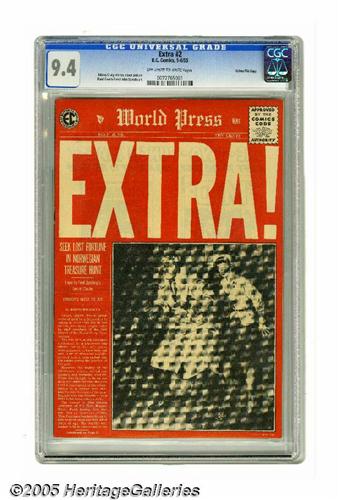 <B>Extra! #2 Gaines File pedigree (EC, 1955) CGC NM 9.4 Off-white to white pages.</B></I> Johnny Craig's painted journalistic-style "photo" cover really stands out against a bright red background. The second issue of this short-lived EC crime series features interior art by Reed Crandall, and John Severin. Overstreet 2005 NM- 9.2 value = $180. This is the highest grade given to a copy of this issue by the CGC to date. While CGC has certified this issue as a Gaines File copy, no certificate accompanies this lot. CGC census 7/05: 3 in 9.4, none higher.
