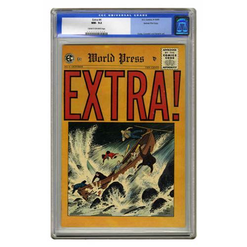 <B>Extra! #4 Gaines File pedigree 1/12 (EC, 1955) CGC NM- 9.2 Cream to off-white pages.</B></I> This "torn-from-the-headlines" title is highlighted by the art of Johnny Craig, Reed Crandall, and John Severin. Only one more issue followed before this "New Direction" comic dead-ended. William Gaines, Russ Cochran, and Bob Overstreet selected this copy as the nicest representative of #4, among the Gaines File Copies. Overstreet 2005 NM- 9.2 value = $180. CGC census 12/05: 1 in 9.2, 4 higher.