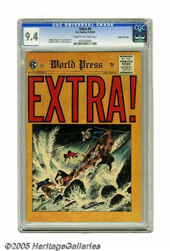<B>Extra! #4 Gaines File pedigree (EC, 1955) CGC NM 9.4 Cream to off-white pages.</B></I> Another mind-blowing issue from Gaines' files, Johnny Craig wrote these stories, which feature art by himself, Reed Crandall, and John Severin. Overstreet 2005 NM- 9.2 value = $180. While CGC has certified this issue as a Gaines File copy, no certificate accompanies this lot. CGC census 7/05: 2 in 9.4, 2 higher.