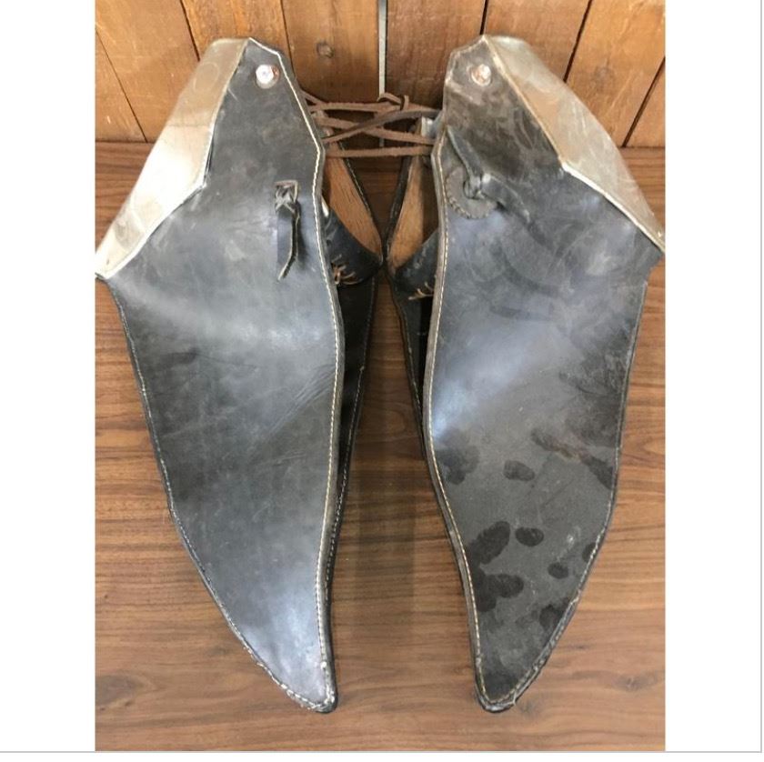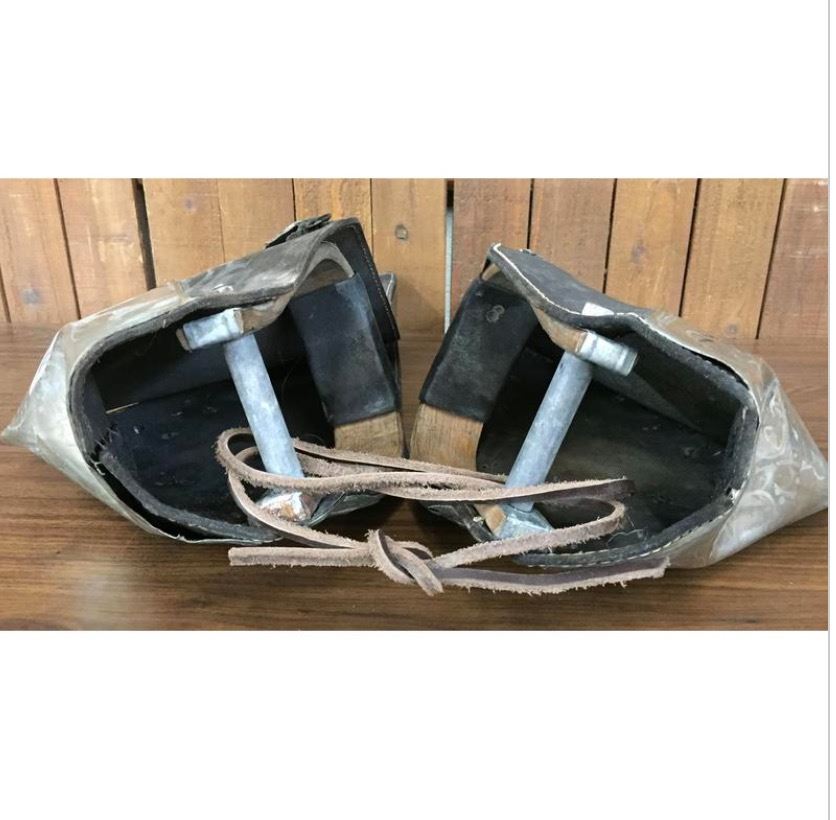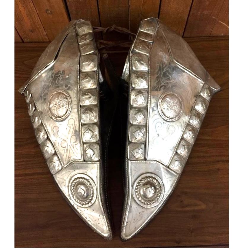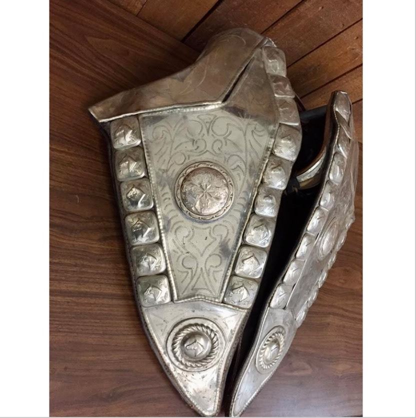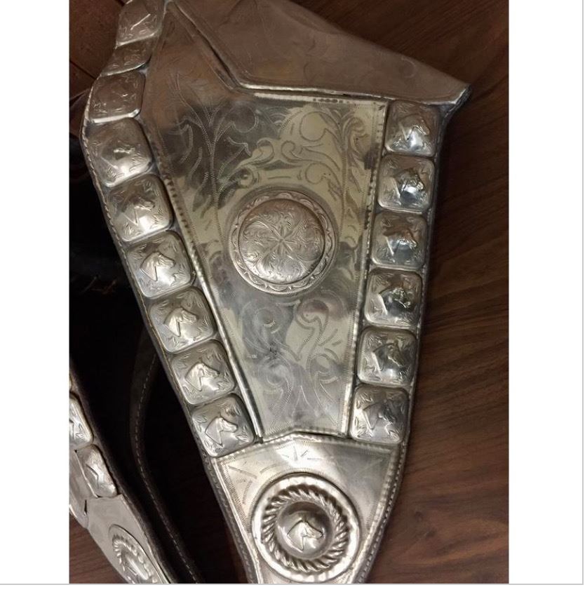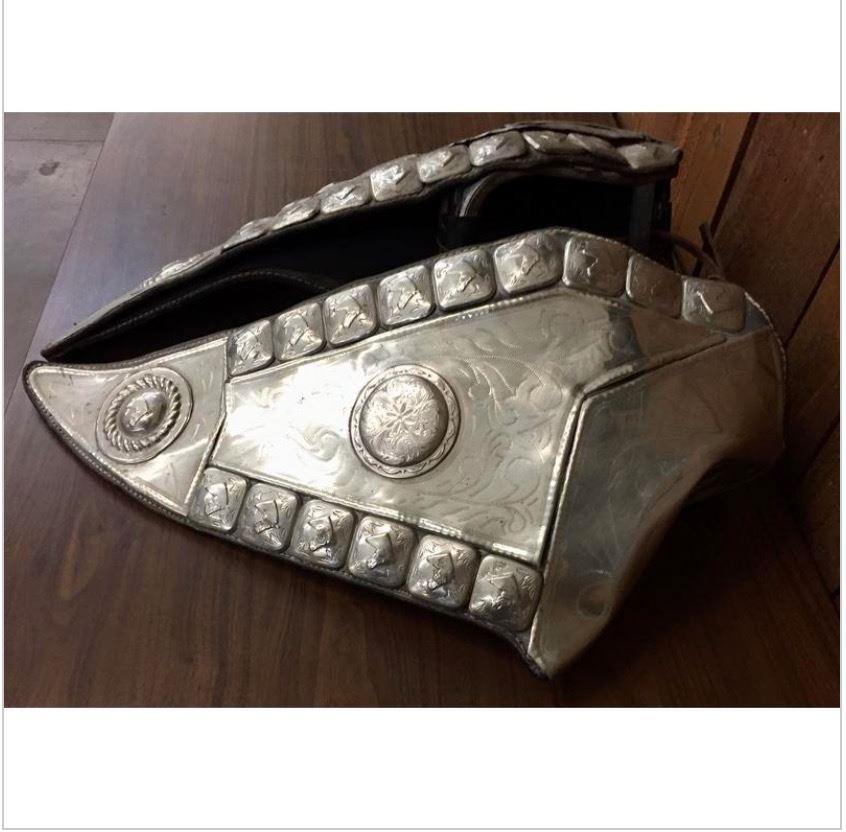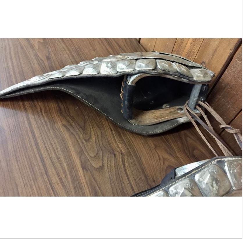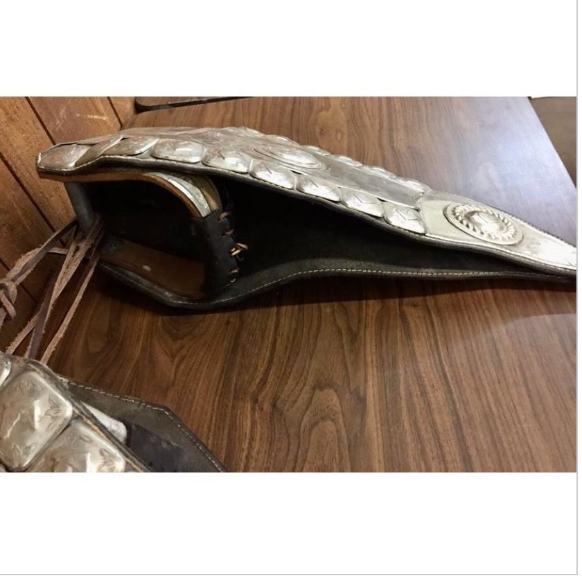 Description: Included in this lot is a pair of leather Parade Tapaderos featuring a stamped Monel silver overlay and conchos covering the leather. Maker: Unmarked, but most likely Ted Flowers. Approx. Age: Vintage. Size: 11-1/2”w x 22-1/2” long. Condition: Good for their age, normal wear expected. Please look closely at the pictures - they are an important part of our description. Shipping: There will be a $15 handling / packaging fee for shipping this lot. The actual cost of postage will be added on top of that. BUY IT NOW: If you would like to buy this item now without waiting for the auction to end (this option is only available up to 48 hours before the auction starts to close), the “Buy it Now” price is the high estimate of this lot. If you would like to end the auction early and pay the high estimate (plus applicable fees), please contact us by phone or email and reference this lot number.