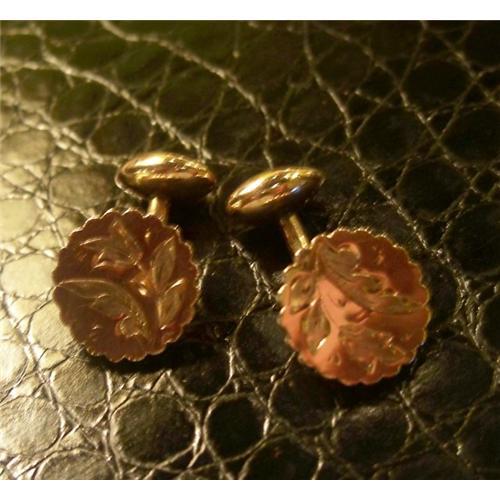 Here we have some very fine and nearly mint gold filled antique cufflinks from the late 19th century. They are engraved with a foliate motif and have a scalloped edge. The disk is 1/2" in diameter. They are in excellent condition and very high quality. C1880.