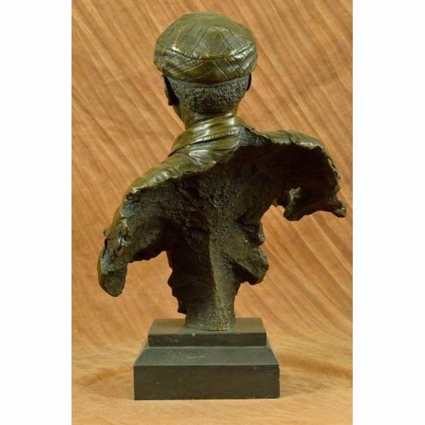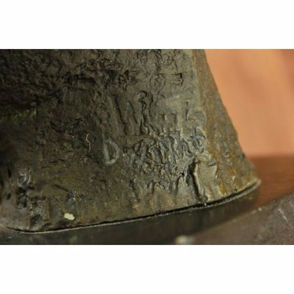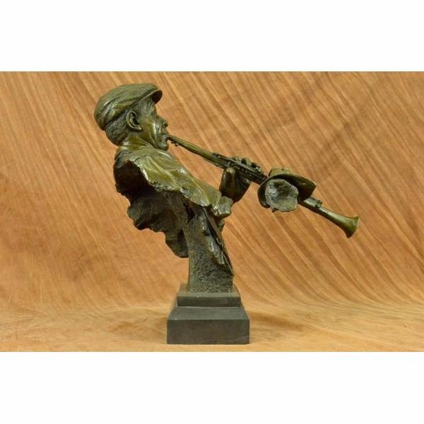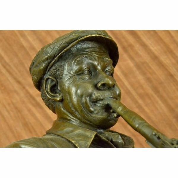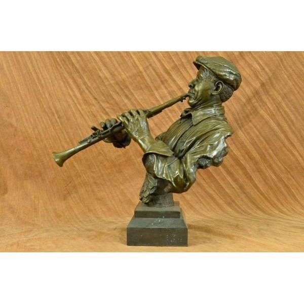 This figurine is a great way to show you're love for music off in your home. Great gift for anyone with a passion as strong as yours. A handsome bronze statue of a Black Musician playing the clarinet, standing. About 16.5" in height. Felt covered underside on the marble base. The 100% bronze sculpture was cast using the ancient method of lost-wax casting and stained with a brown patina finish. The bust is mounted upon a black, variegated marble base with the artist Dwight'ssignature. Condition: This sculpture is in a perfect condition. Bronze Dimensions with Marble Base:Height 18" x Width 20" Marble Dimensions: 7" X 6". Height without base: 15" Weight : 37 LBS Inventory:21YRD48318912