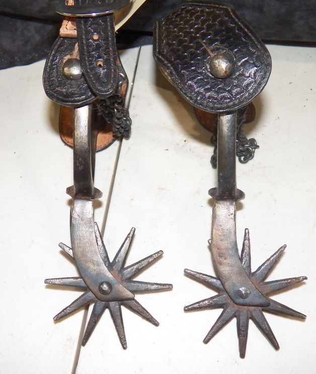 Extra Large Buermann spurs Slab shank 3 1/4"-10 Point Rowels, Overall length 7 1/4", Opening at heel