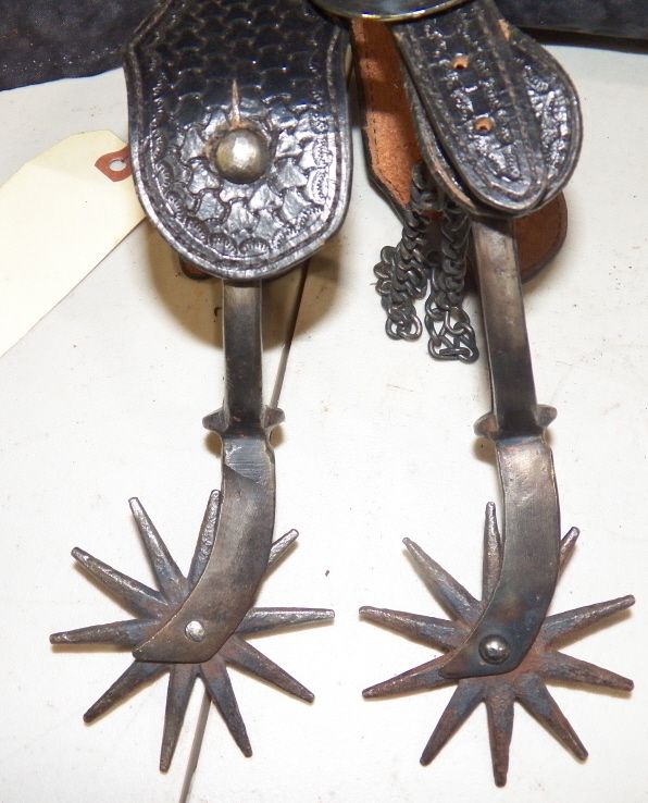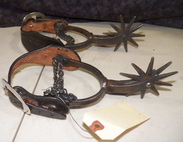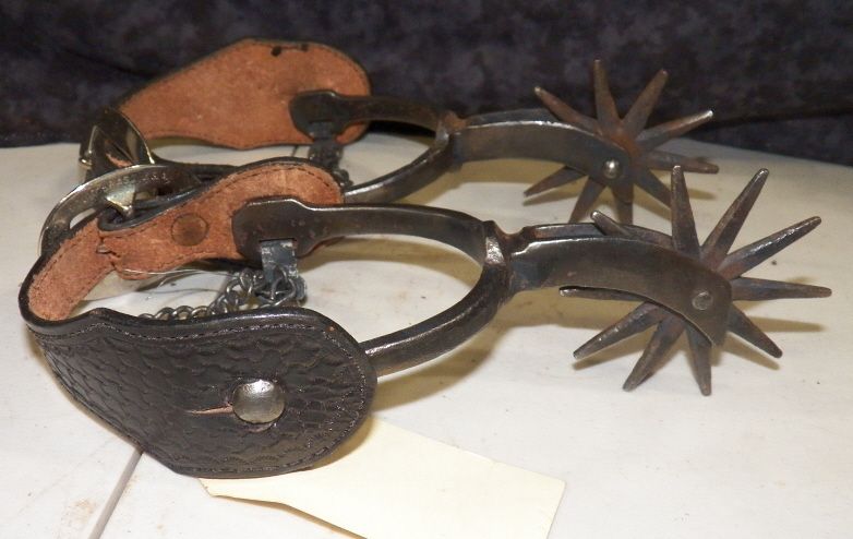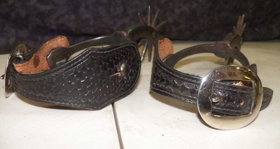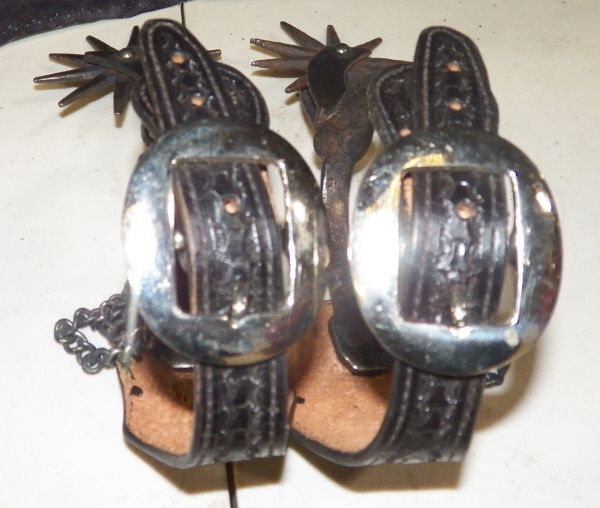 Slab shank 3 1/4"-10 Point Rowels, Overall length 7 1/4", Opening at heel band is 3 1/8" Spurs come with a nice pair of black Straps