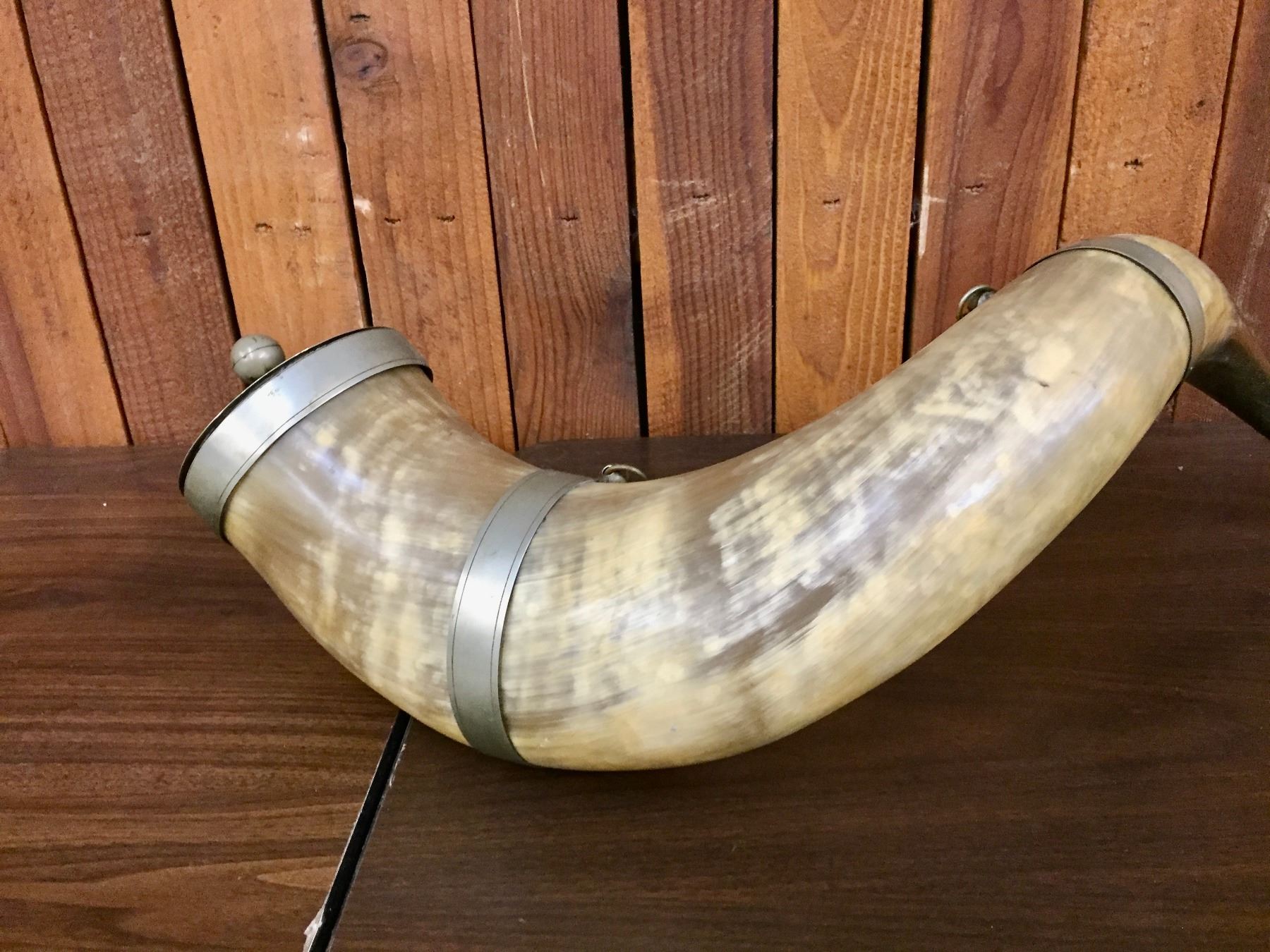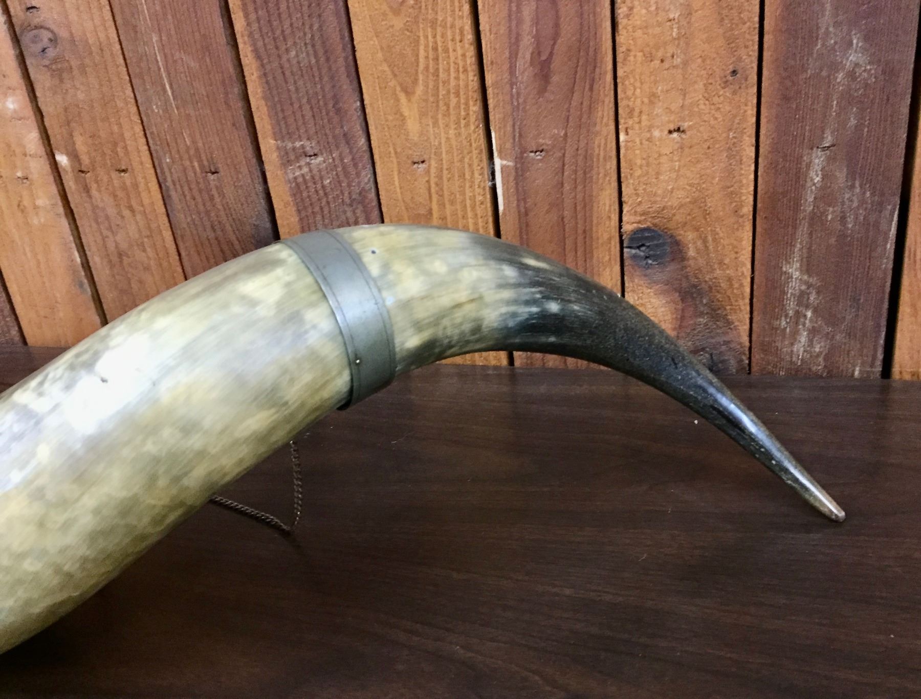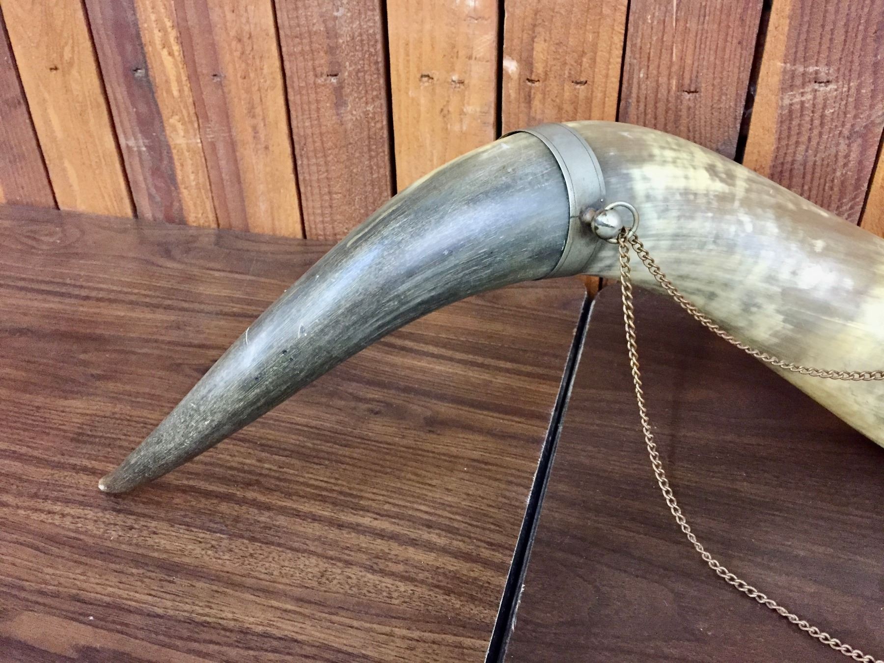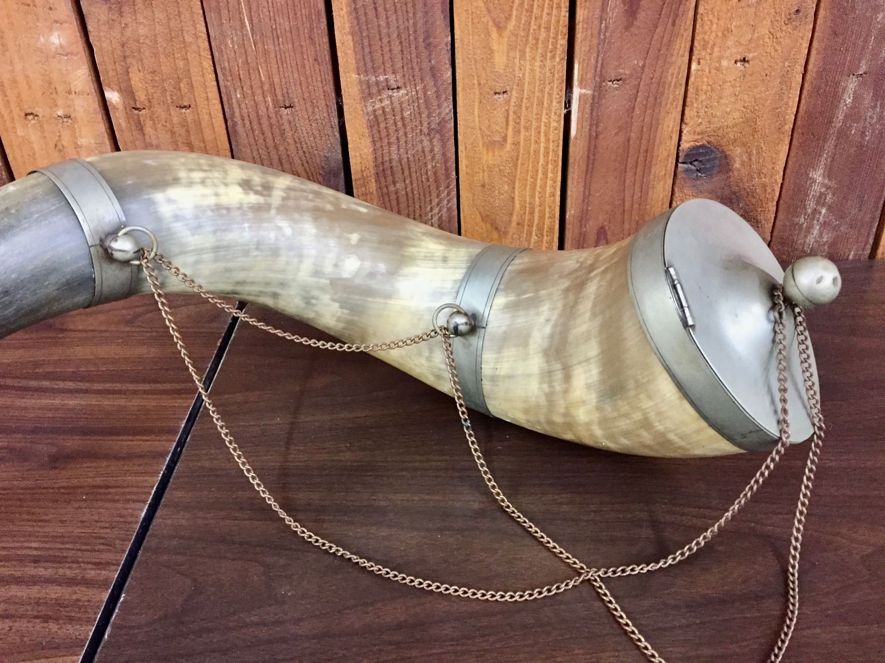 Description: For your consideration we offer this extra large black powder horn with metal accents and a long chain.