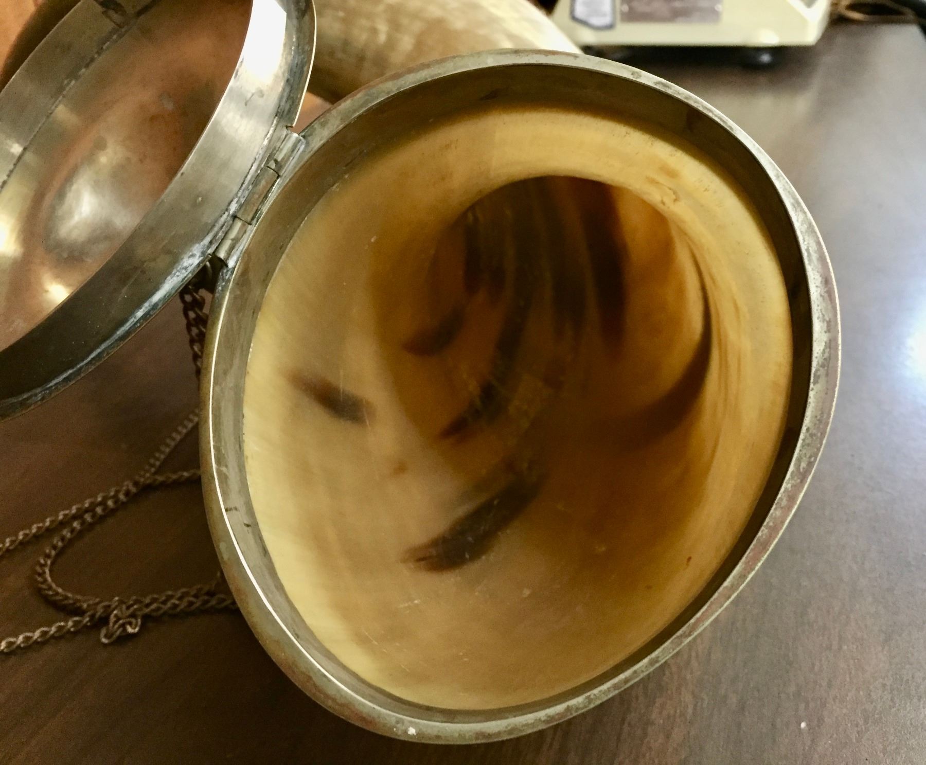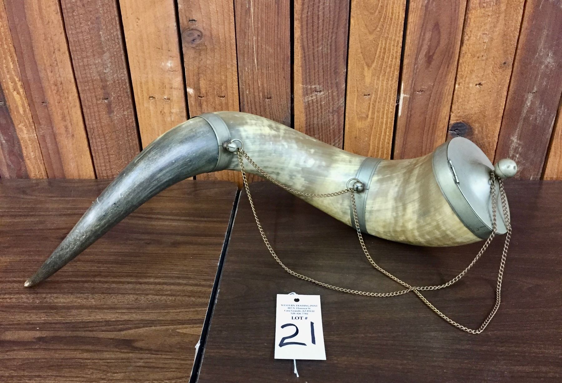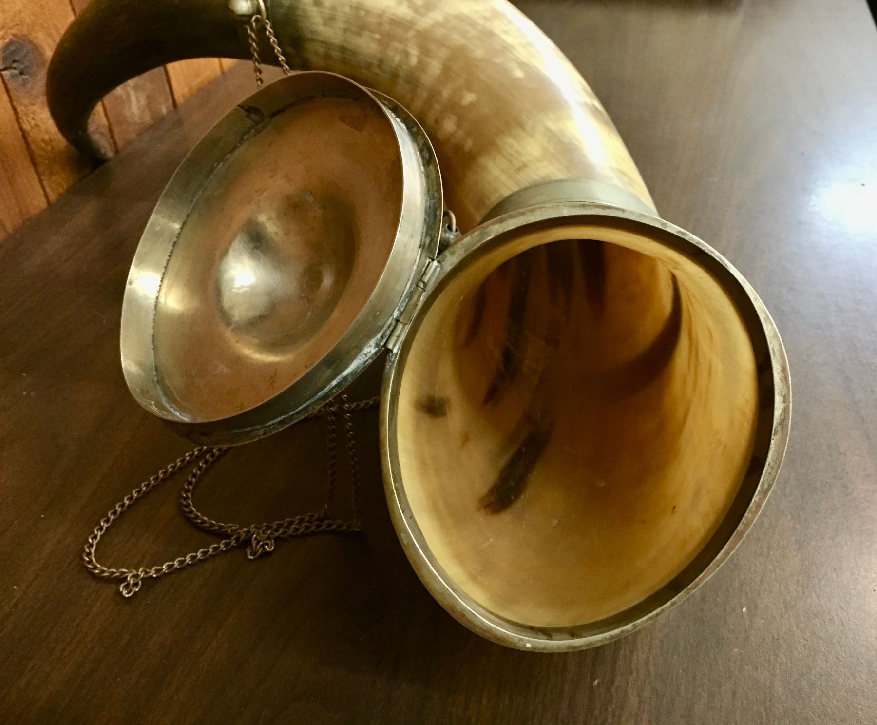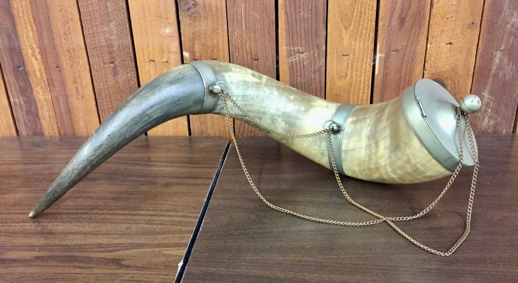 Description: For your consideration we offer this extra large black powder horn with metal accents and a long chain.