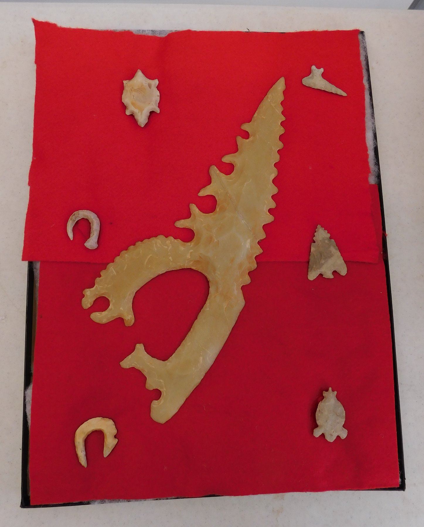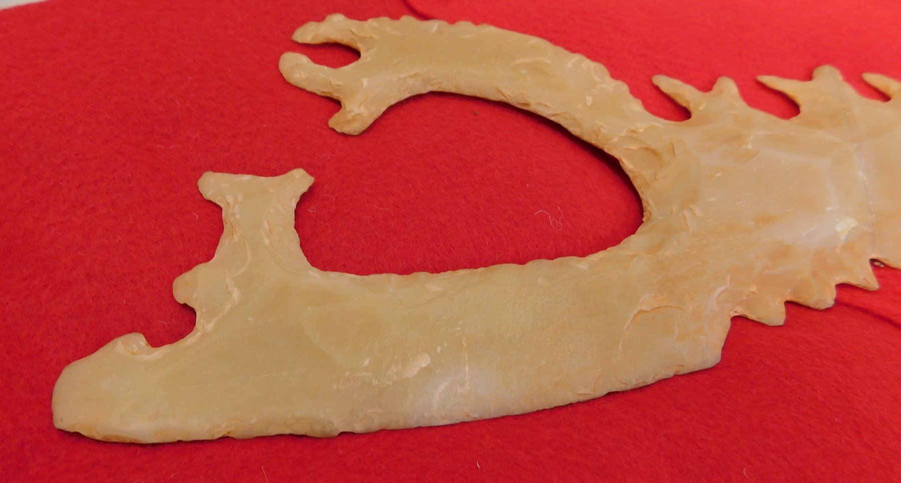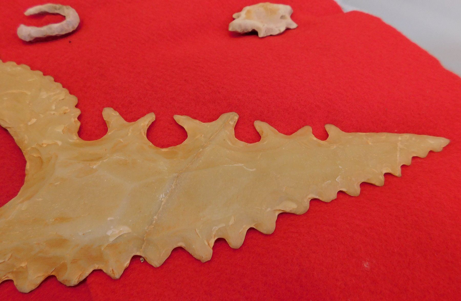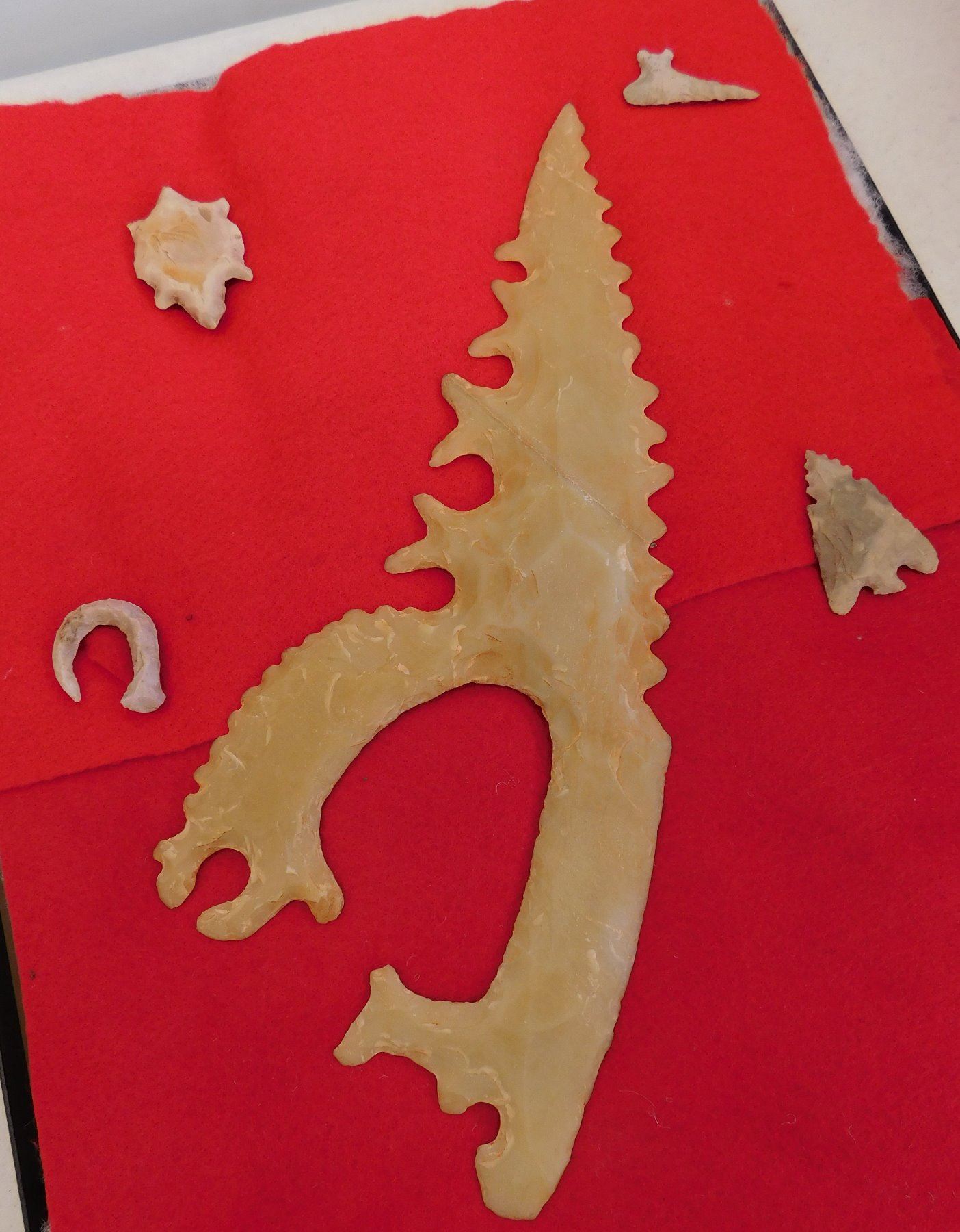 Extra Large Tussinger, late historic period. This translucent quartz Tussinger measures 12.5" x 5" x 3/4". The largest seen to date. Oklahoma. Other eccentrics measure from 1 1/2" to 2 1/4" long. Frame not included. Condition: Good, see images. Shipping: $45.00 w/insurance ands signature, due to value.