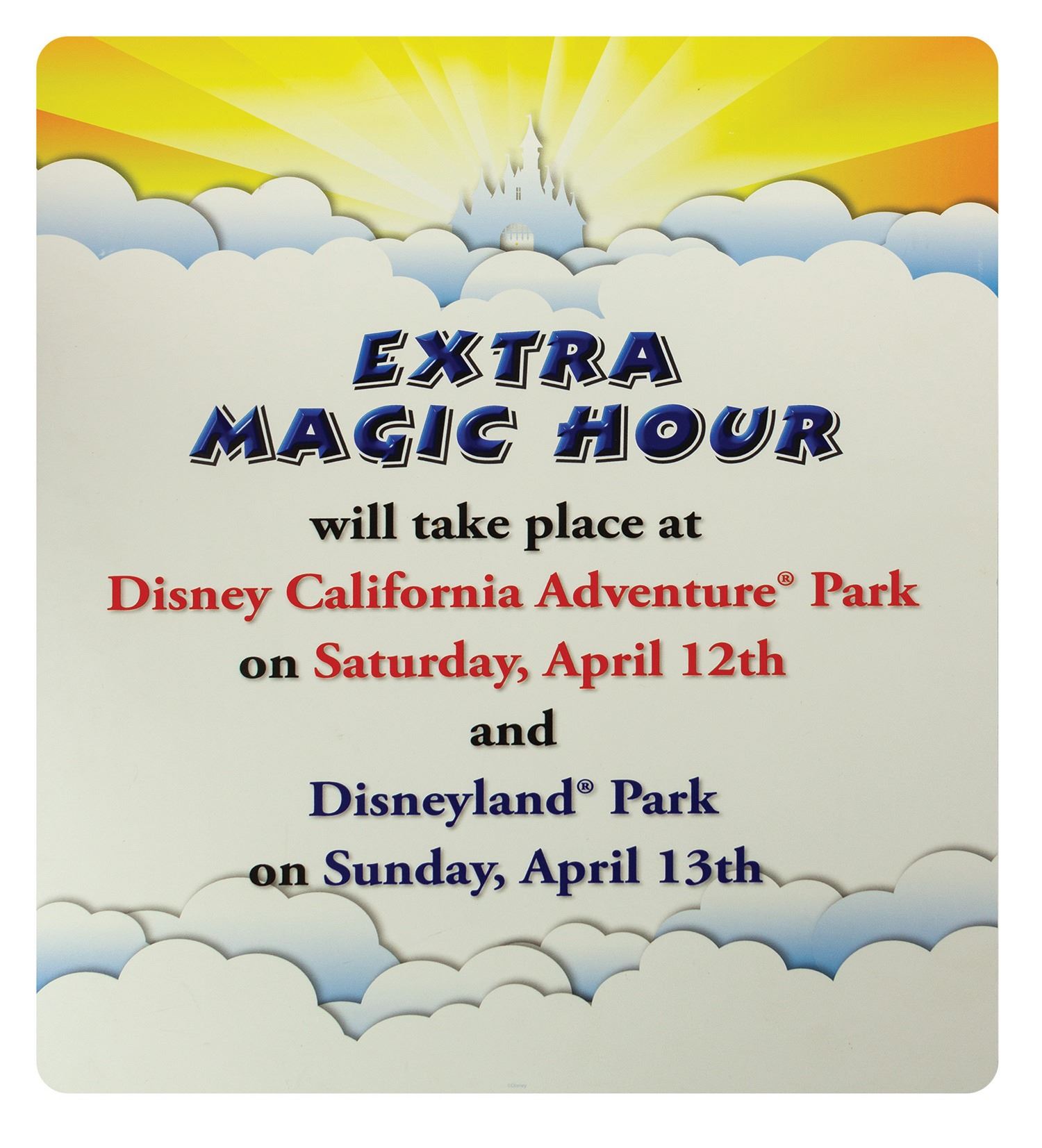 (Disneyland, 2014) An original sign used to announce the Extra Magic Hour for Disneyland and California Adventure. The Extra Magic Hour is a benefit for registered Disneyland Hotel guests to be able to enter the park one hour before the regular opening time. Printed on PVC board, the sign measures 29.75"x23.75" and is in very good condition with minor surface scuffs from use.