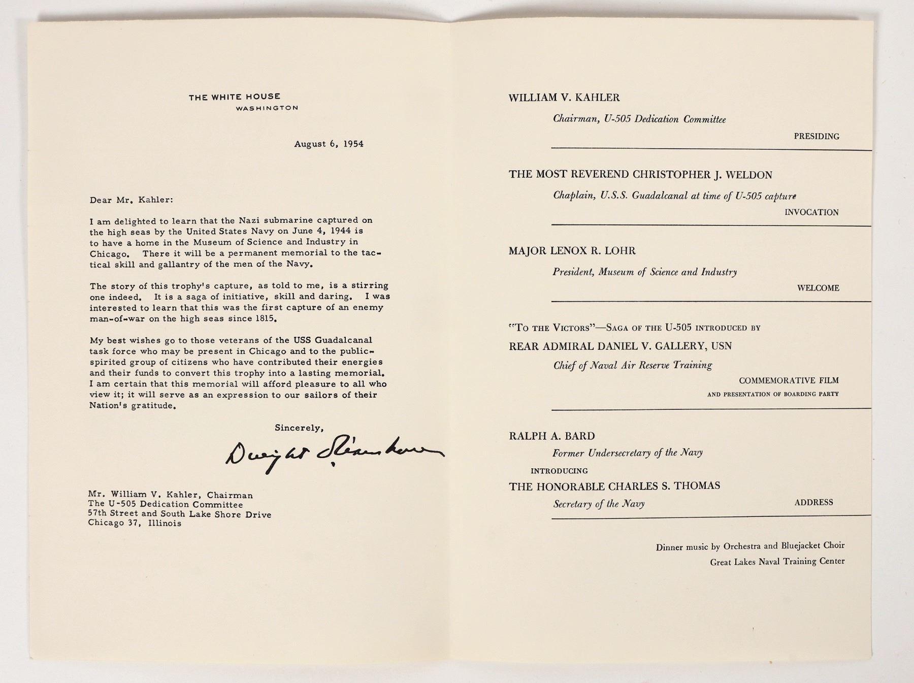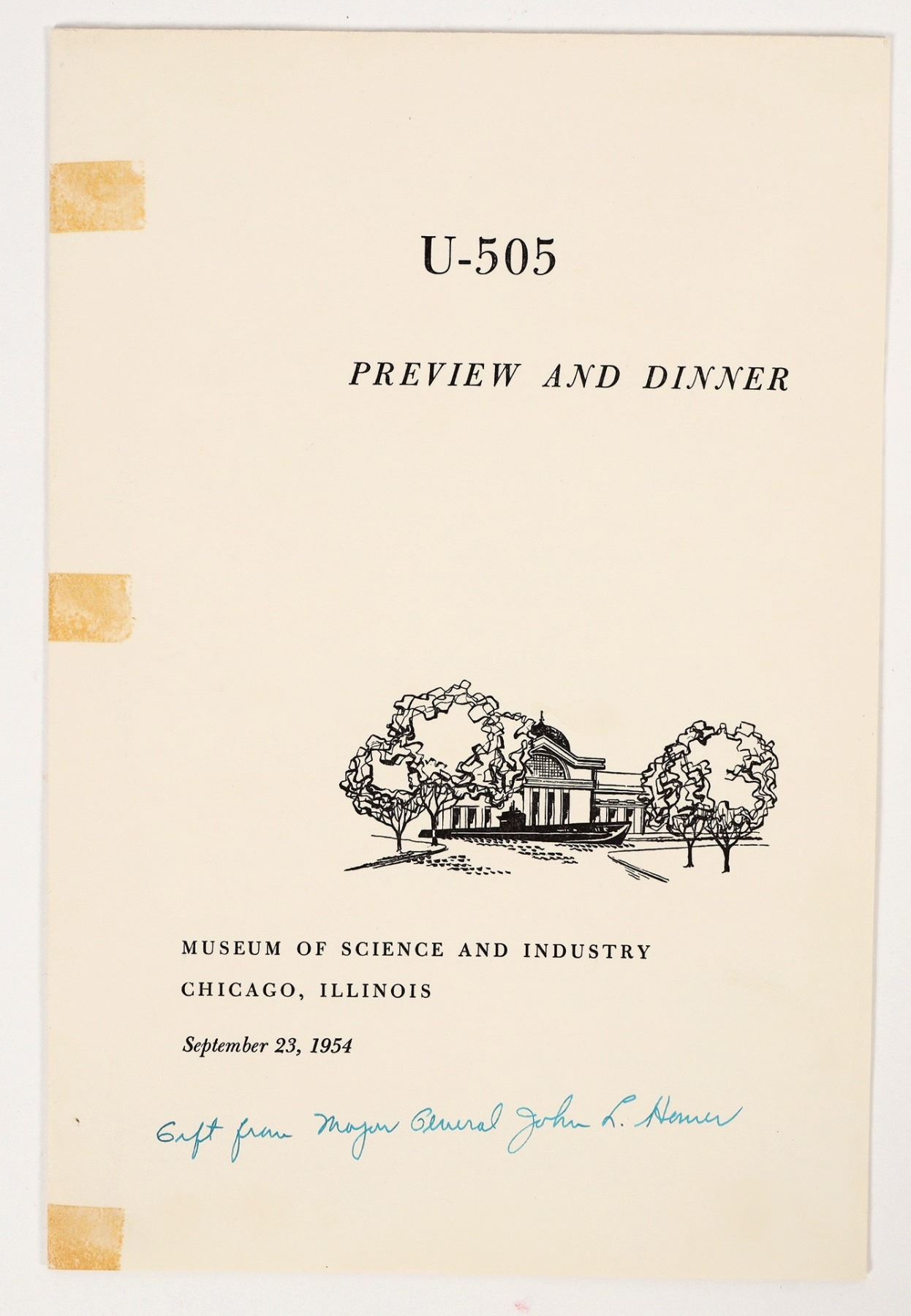 Museum letter discussing the 1st display of a captured Nazi submarine, gifted from a high ranking member of the US military. A U-505 was sent to Museum of Science and Industry, Chicago, IL for permanent display. Unfolds to a full measurement of 12x18", each individual "page" measures 6x9", meant to be read like a menu. Very good condition, no apparent foxing, tearing, or toning besides for 3 possible adhesive residue marks about .75" long and .5" thick on the cover. See photo.