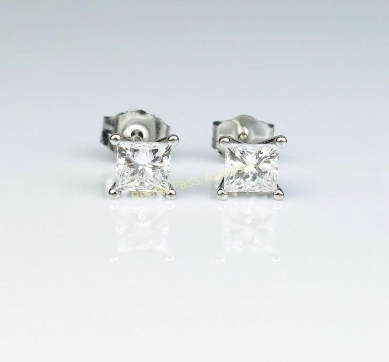 diamond stud earrings weighing approx. 0.90 carats of E/F colors and VS/ SI clarity set in 14 karat white gold four prong settings. Retail $3,000-$4,000