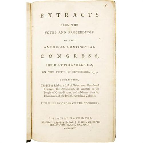 <B><I>Extracts from the Votes and Proceedings of the American Continental Congress</B></I></B></I><I>, Held at Philadelphia, on the Fifth of September, 1774</B></I> (Philadelphia Printed. London: Reprinted for J. Almon, 1774), 68 pages, marbled paper boards shelf backed in cloth with a later black glaze applied to the spine, 8vo (5.25" x 8"). Bound with <B><I>Journal of the Proceedings of the Congress</B></I></B></I><I>, Held at Philadelphia, May 10, 1775</B></I> (Philadelphia Printed. London: Reprinted for J. Almon, 1776), 200 pages plus eight pages of advertisements. The book is in good condition, with worn edges & spine ends, and bumped corners. Typical minor toning to textblock.<BR><BR><b>Shipping:</b> Books & Catalogs (<a target="_blank" href="http://www.heritageauctions.com/common/shipping.php">view shipping information</a>)