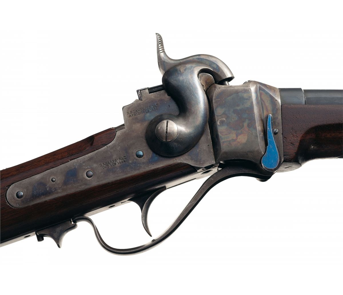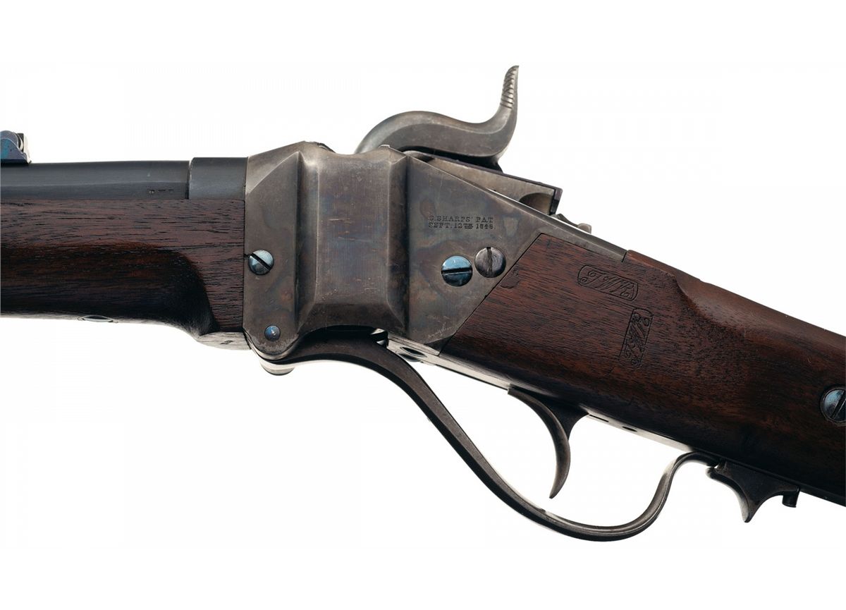 This Sharps New Model 1863 rifle was manufactured in 1865. The Ordnance Department purchased a number of Sharps rifles to arm the U.S. Veteran Volunteer Infantry regiments formed in 1865 to serve as an elite infantry corps. The U.S. Veteran Volunteer Infantry regiments were armed with Sharps, Spencer and Henry rifles; as an incentive to enlistment volunteers were allowed to retain their weapons when they were discharged. The Civil War ended before the U.S. Veteran Volunteer Infantry regiments saw action. The rifle has a one inch rib on the underside of the barrel for a saber bayonet, 900 yard R.S. Lawrence patent folding rear sight, Lawrence pellet primer and stock with casehardened patch box. The barrel is blued and the forearm cap, barrel bands, receiver, hammer, lever, patch box and buttplate have a color casehardened finish. The screws, band springs, rear sight base, breechblock and pellet primer have a fiery niter blue finish. The stock and forearm are straight grain black walnut with an oil finish. The top of the barrel is roll-stamped "SHARPS RIFLE/MANUFG. CO./HARTFORD CONN." in three lines ahead of the rear sight. "NEW MODEL 1863" is roll-stamped between the rear sight and the receiver. R.S. Lawrence patent markings are stamped on the upper right side of the receiver below the pellet primer and Sharps patent markings are stamped on the side plate and the left side of the receiver. The serial number, "C.39309", is roll-stamped on the upper receiver tang. The left side of the stock wrist is stamped with two Ordnance sub-inspection/final inspection marks at right angles to each other. Each stamp consists of the script initials "TWR" in a rectangle with rounded ends. The Ordnance inspector's initials "T.W.R." are stamped on the left barrel flat. The stock is stamped with the sub-inspection marks "M.N.M." near the heel and the bottom of the forearm is stamped with a "N.S.P." sub-inspection mark.