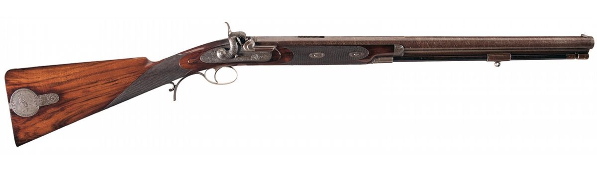 This is an exceptional example of a W.& C. Scott Jacobs percussion rifle which was made as part of a collection of guns specially made for display at the 1862 International Exhibition in London, England. That was the first major venue at which Scott guns were exhibited. This rifle and a double rifle, now in the possession of Holland & Holland, are the only two known survivors of that exhibition, making this rifle extremely rare . The rifle was manufactured in 1862 and is a single barrel example of a Jacobs rifle which was invented by General John Jacob, C.B. The single barrel rifle was developed in the mid-1840s and differed substantially from the military rifles in that it was of a much smaller bore and shorter barrel. Jacob was associated with the East India Co. and tried unsuccessfully to get his double rifle accepted by the Indian Government in 1846. The rifle has a Damascus pattern barrel and solid under rib, with 11 inches of the breech end having a top flat, blade front sight and five separate folding rear sight leafs. The top flat ahead of the rear sight is marked "1862" and behind the sight "W.&C. SCOTT & SON MAKERS 95 BATH ST BIRMINGHAM/EXHIBITED IN THE INTERNATIONAL EXHIBITION LONDON". The hammer, lock, trigger guard and breech plug are very nicely floral scroll engraved. The top flat of the breech plug has a shell design surrounded by floral scroll designs. The lock is marked "W.&C. SCOTT & SON" and in addition to the scroll engraving has a deer lying in a field scene at the front and a buck in a wooded scene at the rear. The lock is equipped with a sliding hammer safety. The trigger guard has a finely checkered grip spur, ebony ram rod with brass end, with a sling eye on the forward pipe and mounted with a one piece walnut straight grip checkered half stock secured by two wedges with engraved escutcheons, teardrop flats and engraved patch box, with a deer in a field scene and floral scroll designs. The buttplate is a shotgun style, finished in bright blue with engraved screw heads. The accompanying W.&C. Scott letter verifies the above information and under estimated production states "Unique, as far as known".