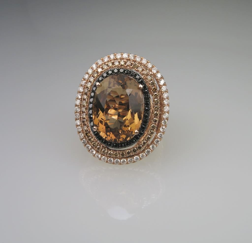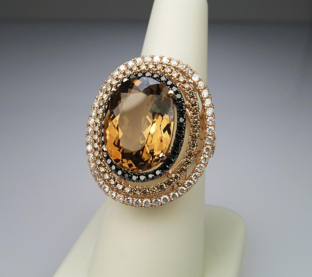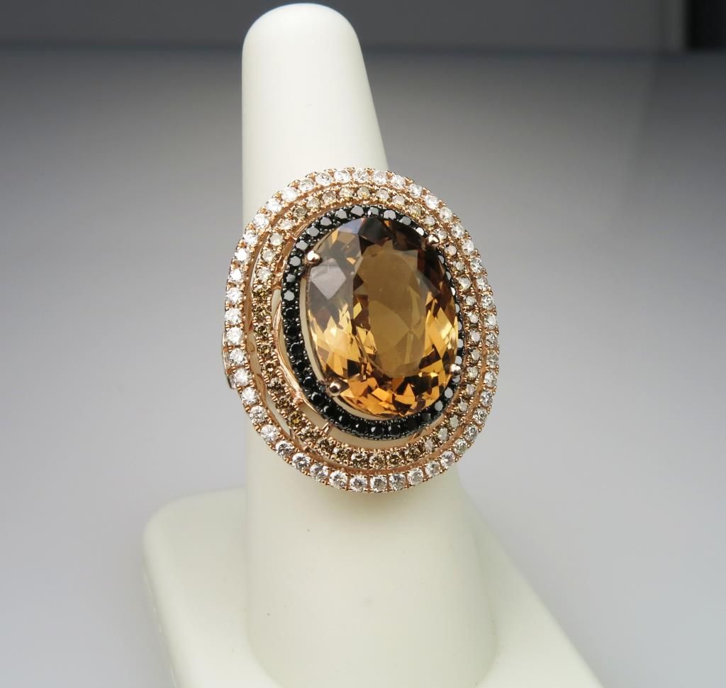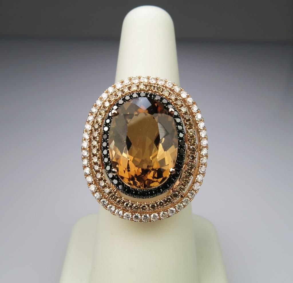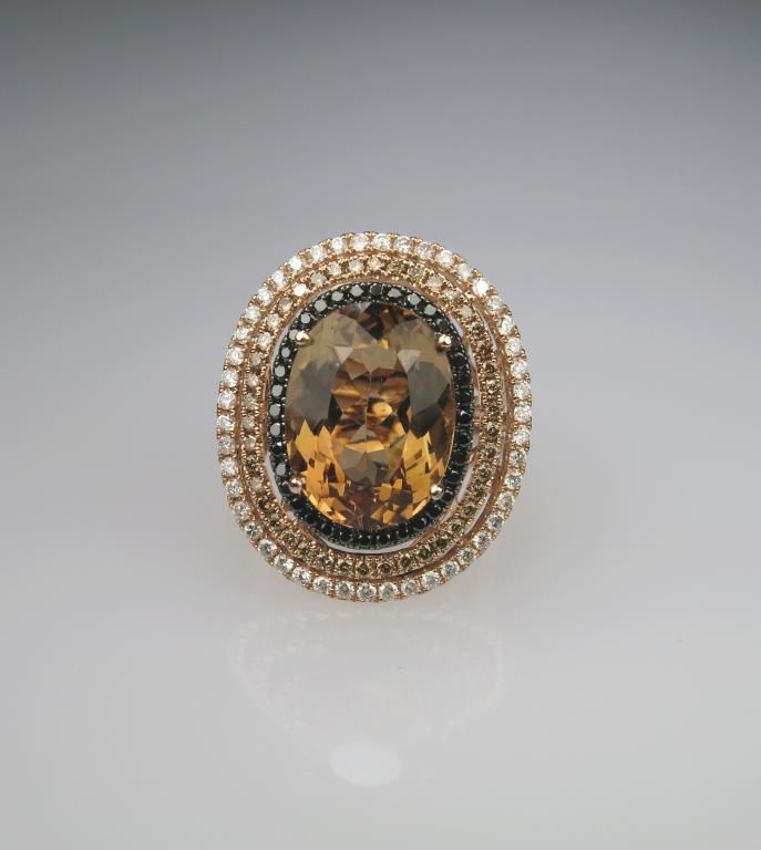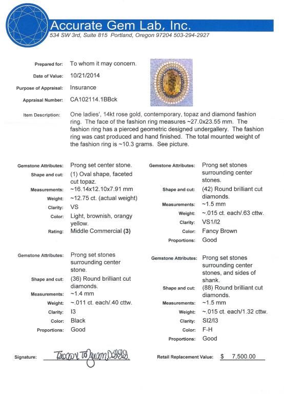 Extraordinary FINE Imperial Topaz and Multi-Colored Diamond Ring with 12.75 carat Topaz of rich golden peach color and VS clarity with 166 round cut white, champagne and black Diamonds weighing approx. 2.35 carats total set in triplehalo setting weighing over 10.3 grams of rose gold. Wonderful Custom Piece. Please See Full Appraisal. Retail $7,000-$8,000. Estimate $4,500-$6,000.