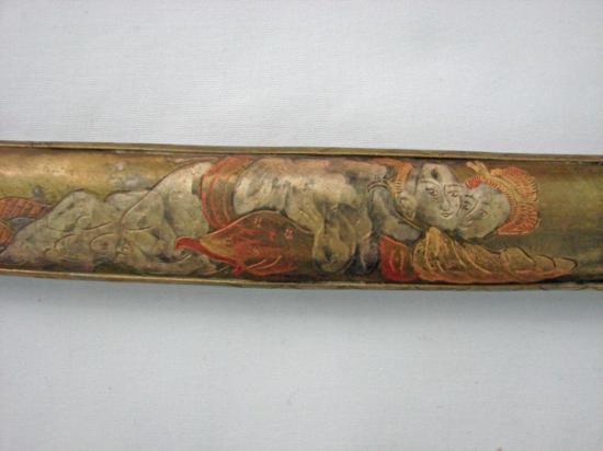 Extraordinary Japanese Samuri / Katana Sword, strikingly detailed Romantic Saya, signed blade. The Japanese sword was known as the Samurai sword all of the world , which is a kind of superb weapon. The first metal sword was got from a grave in Japan. From the 3rd to the 8th century, chinese and Korean craftsman came over to Japan. Tachi developed into KATANA during the middle of the 10th century, because the Japanese cavaliers required weapons match surprise attacks. After Japanese was defeated in the second World War, all activities concerning the Japanese swords were suspended by the Allied Forces. But the activities were gradually resumed in the wake of Japans independence in 1950 and the beauty of the Japanese sword is appreciated by many people both in and outside of Japan nowadays, and become a good choice of art work collection. Saya is the Japanese term for a scabbard, and specifically refers to the scabbard for a sword or knife.