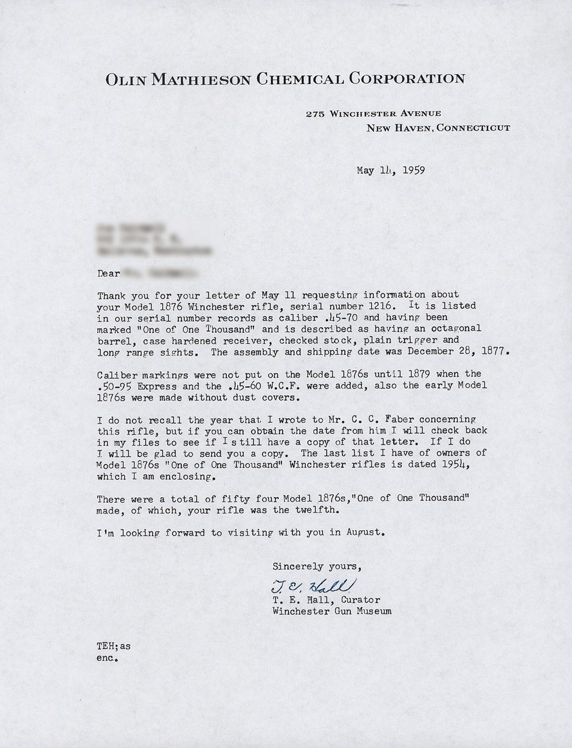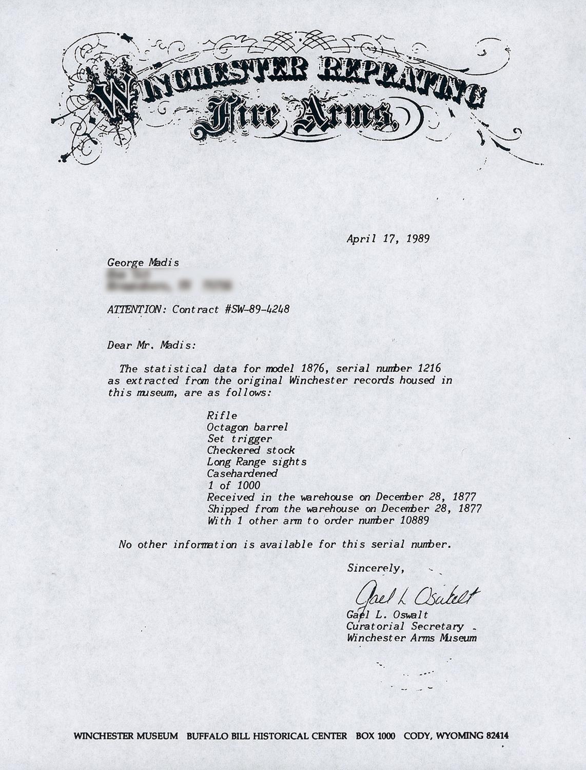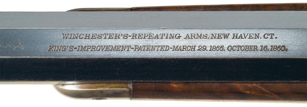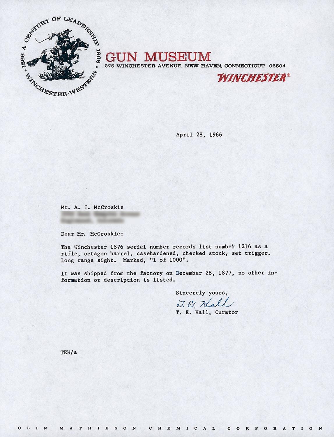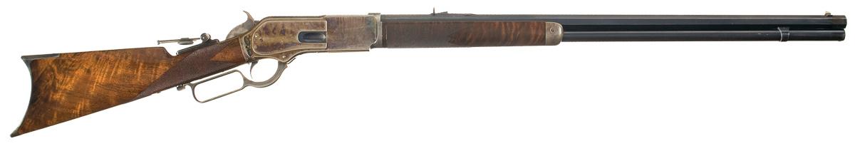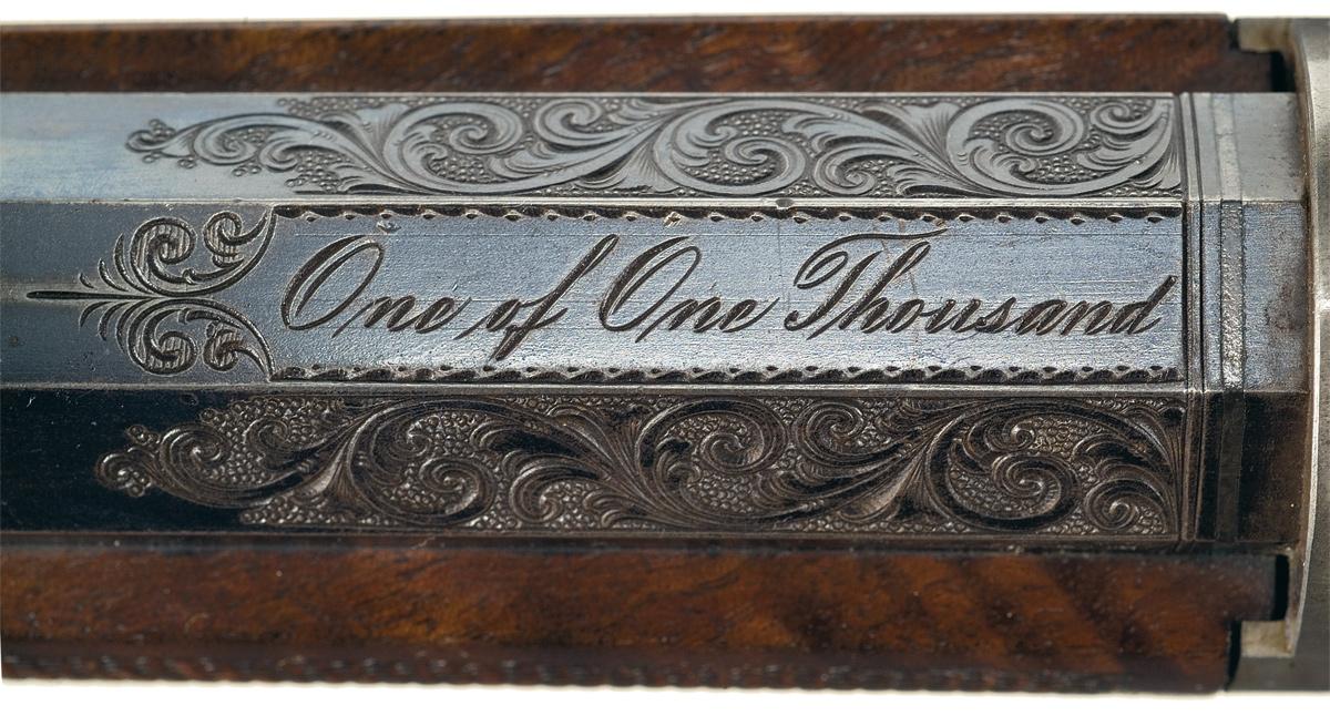 Winchester Deluxe, "One of One Thousand", First Model 1876 Sporting Rifle manufactured in 1876. The "One of One Thousand" Model 1876 Rifle is one of the most desirable of all Winchester firearms. This rifle has a blue, full octagon, barrel and full-length magazine. The forearm cap, receiver, hammer, loading lever and crescent buttplate are color casehardened. The loading gate, trigger and bolt are niter blue. All of the components have the special "extra finish" found on "One of One Thousand" or "One of One Hundred" firearms. The stock and forearm are highly figured, fancy grain, walnut with fine checkering and a varnished "piano" finish. The top of the barrel is engraved "One of One Thousand" between the rear sight and the receiver in an engraved panel with scalloped borders. The adjacent barrel flats are decorated with open scroll engraving on a punch-dot background. The barrel muzzle is engraved with scrollwork on a punch-dot background. The barrel muzzle and breech are inlaid with gold bands. The barrel is fitted with a fixed, dovetail mounted, front sight with nickel-silver blade and a sporting style rear sight. A graduated peep sight is mounted on the receiver tang. The rifle has a single set-trigger. The receiver is the early First Model style with no dust cover rail or dust cover. The buttplate has a sliding brass trapdoor and the butt trap contains a jointed steel cleaning rod. The top of the barrel is roll-stamped "WINCHESTER'S-REPEATING ARMS. NEW HAVEN. CT./KING'S-IMPROVEMENT-PATENTED-MARCH 29.1866. OCTOBER 16. 1860". The serial number, "1216" is engraved on the lower tang behind the loading lever latch. The rifle has a .45 caliber bore but has no visible caliber markings. The "One of One Thousand" barrel markings, script engraving and inlays on the barrel and muzzle, select walnut stock and forearm, "extra finish" bluing and case colors and set-trigger are typical features of Winchester Model 1876 "One of One Thousand" rifles. Provenance: A. I. McCroskie Collection. The accompanying factory letter dated April 17, 1989 verifies the rifle configuration, octagon barrel, set trigger, checkered stock, long range sights, casehardened, "1 of 1000" and that it was shipped with one other gun on December 28, 1877 to order number 10889. There is also a Winchester Museum letter dated April 28, 1966 that verifies the same information, and one dated May 14, 1959 on Olin Mathieson Chemical Corporation letterhead, signed by the Winchester Gun Museum Curator, T.E. Hall, with the addition of 45-70 caliber and states "plain trigger". There are also two other letters of correspondence in reference to the rifle, one makes reference to an individual having a detailed letter from the Museum stating that this rifle was the 12th 1876, 1of 1,000 made.