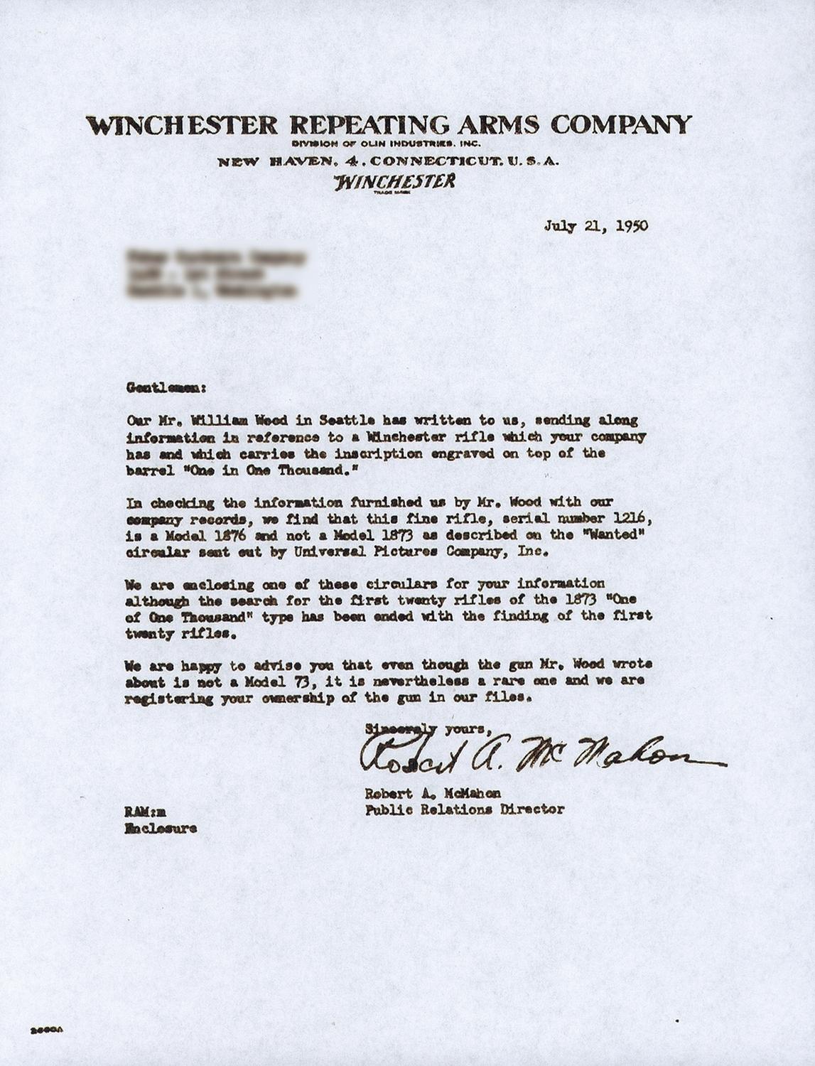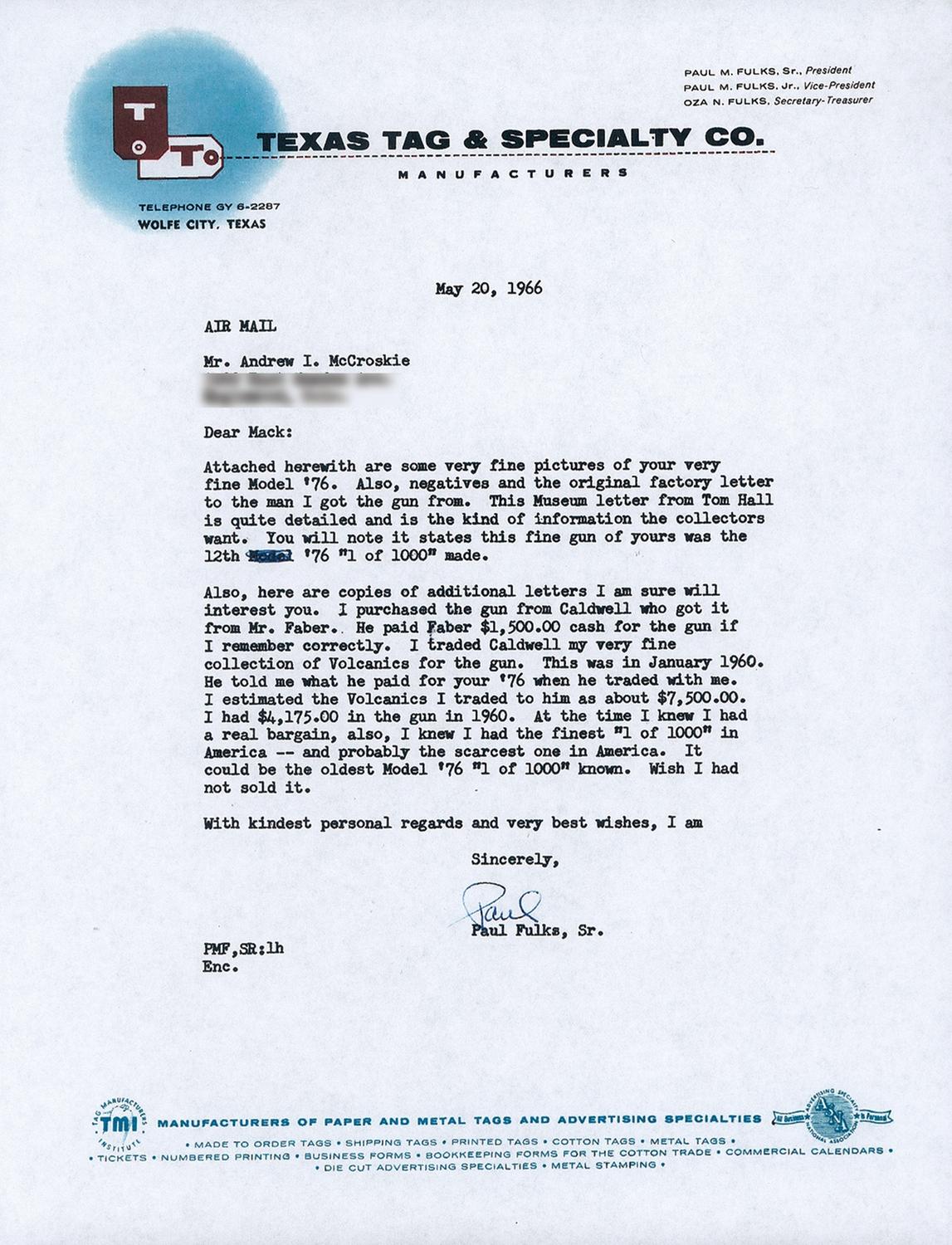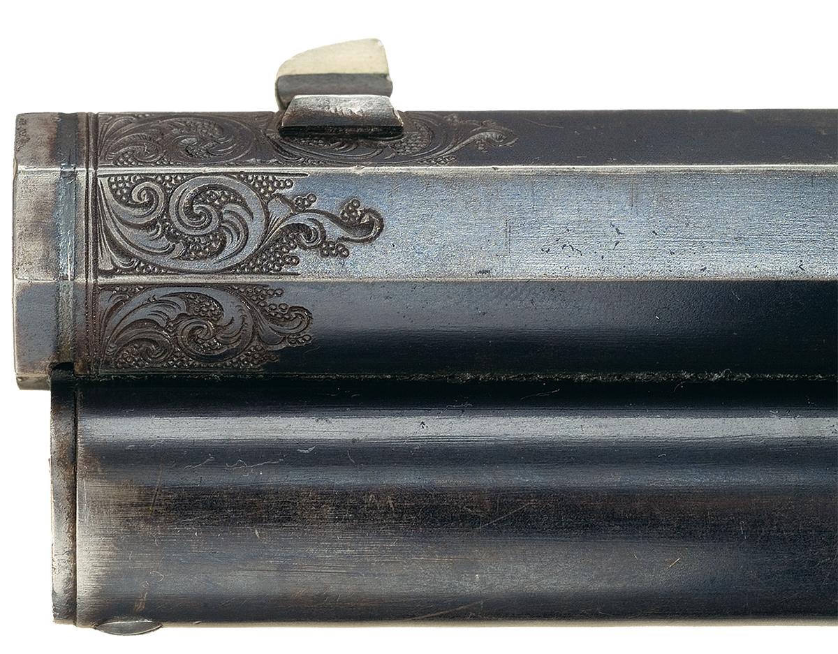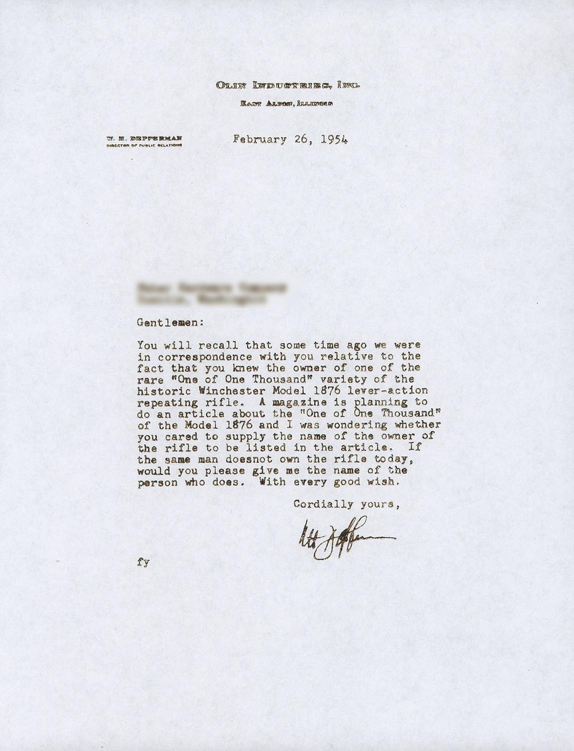 Winchester Deluxe, "One of One Thousand", First Model 1876 Sporting Rifle manufactured in 1876. The "One of One Thousand" Model 1876 Rifle is one of the most desirable of all Winchester firearms. This rifle has a blue, full octagon, barrel and full-length magazine. The forearm cap, receiver, hammer, loading lever and crescent buttplate are color casehardened. The loading gate, trigger and bolt are niter blue. All of the components have the special "extra finish" found on "One of One Thousand" or "One of One Hundred" firearms. The stock and forearm are highly figured, fancy grain, walnut with fine checkering and a varnished "piano" finish. The top of the barrel is engraved "One of One Thousand" between the rear sight and the receiver in an engraved panel with scalloped borders. The adjacent barrel flats are decorated with open scroll engraving on a punch-dot background. The barrel muzzle is engraved with scrollwork on a punch-dot background. The barrel muzzle and breech are inlaid with gold bands. The barrel is fitted with a fixed, dovetail mounted, front sight with nickel-silver blade and a sporting style rear sight. A graduated peep sight is mounted on the receiver tang. The rifle has a single set-trigger. The receiver is the early First Model style with no dust cover rail or dust cover. The buttplate has a sliding brass trapdoor and the butt trap contains a jointed steel cleaning rod. The top of the barrel is roll-stamped "WINCHESTER'S-REPEATING ARMS. NEW HAVEN. CT./KING'S-IMPROVEMENT-PATENTED-MARCH 29.1866. OCTOBER 16. 1860". The serial number, "1216" is engraved on the lower tang behind the loading lever latch. The rifle has a .45 caliber bore but has no visible caliber markings. The "One of One Thousand" barrel markings, script engraving and inlays on the barrel and muzzle, select walnut stock and forearm, "extra finish" bluing and case colors and set-trigger are typical features of Winchester Model 1876 "One of One Thousand" rifles. Provenance: A. I. McCroskie Collection. The accompanying factory letter dated April 17, 1989 verifies the rifle configuration, octagon barrel, set trigger, checkered stock, long range sights, casehardened, "1 of 1000" and that it was shipped with one other gun on December 28, 1877 to order number 10889. There is also a Winchester Museum letter dated April 28, 1966 that verifies the same information, and one dated May 14, 1959 on Olin Mathieson Chemical Corporation letterhead, signed by the Winchester Gun Museum Curator, T.E. Hall, with the addition of 45-70 caliber and states "plain trigger". There are also two other letters of correspondence in reference to the rifle, one makes reference to an individual having a detailed letter from the Museum stating that this rifle was the 12th 1876, 1of 1,000 made.