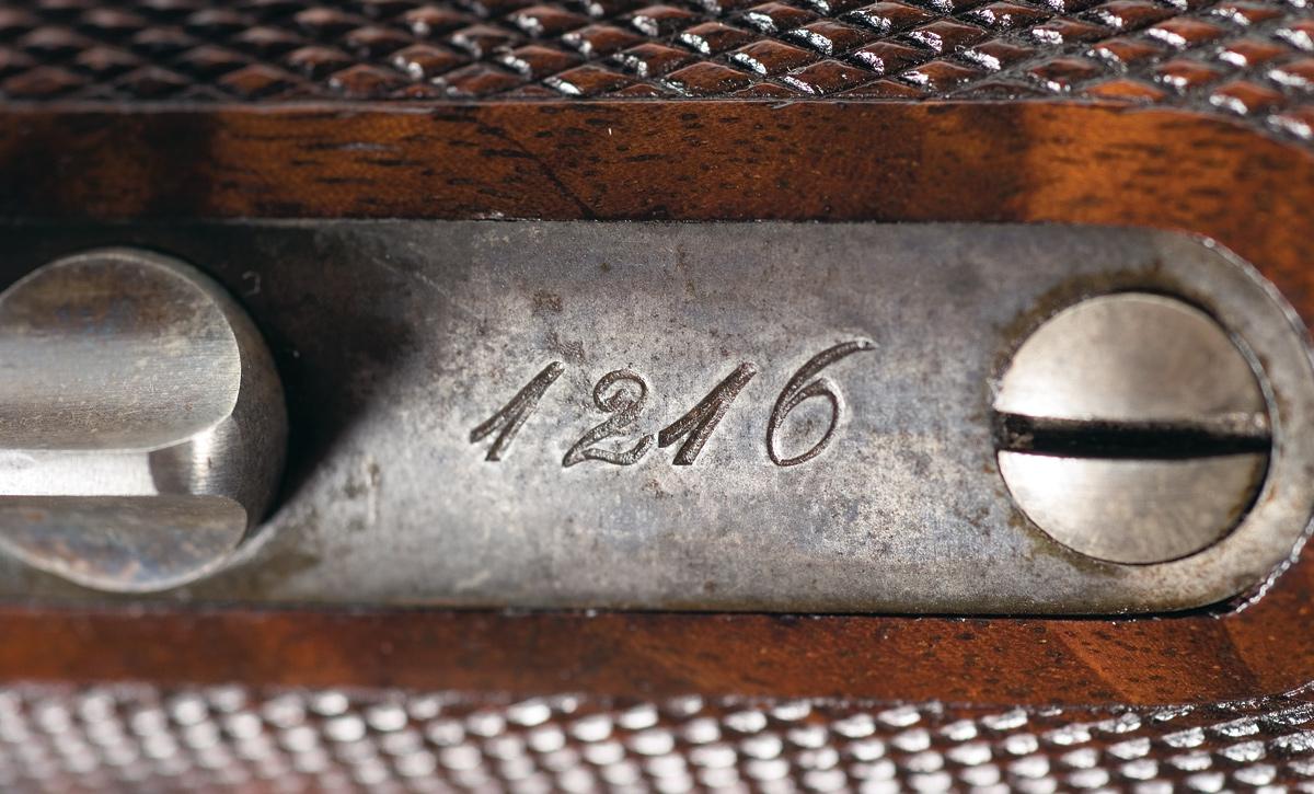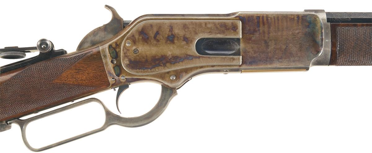 Condition: Excellent. The rifle retains 95% of the original blue and 90% plus casehardened finish. The barrel has some very minor edge wear along the flats. The engraving and barrel markings are extremely crisp. The receiver case colors are vivid; wear is limited to some silvering on the bottom of the loading lever. The case colors on the forearm cap and buttplate have faded to a mottled dove-gray. The stock and forearm are in excellent condition with nearly all of the original piano finish, crisp checkering and only scattered and very minor storage wear. This is a magnificent example of a rare and highly desirable Winchester Deluxe, "One of One Thousand" First Model 1876 Sporting Rifle.