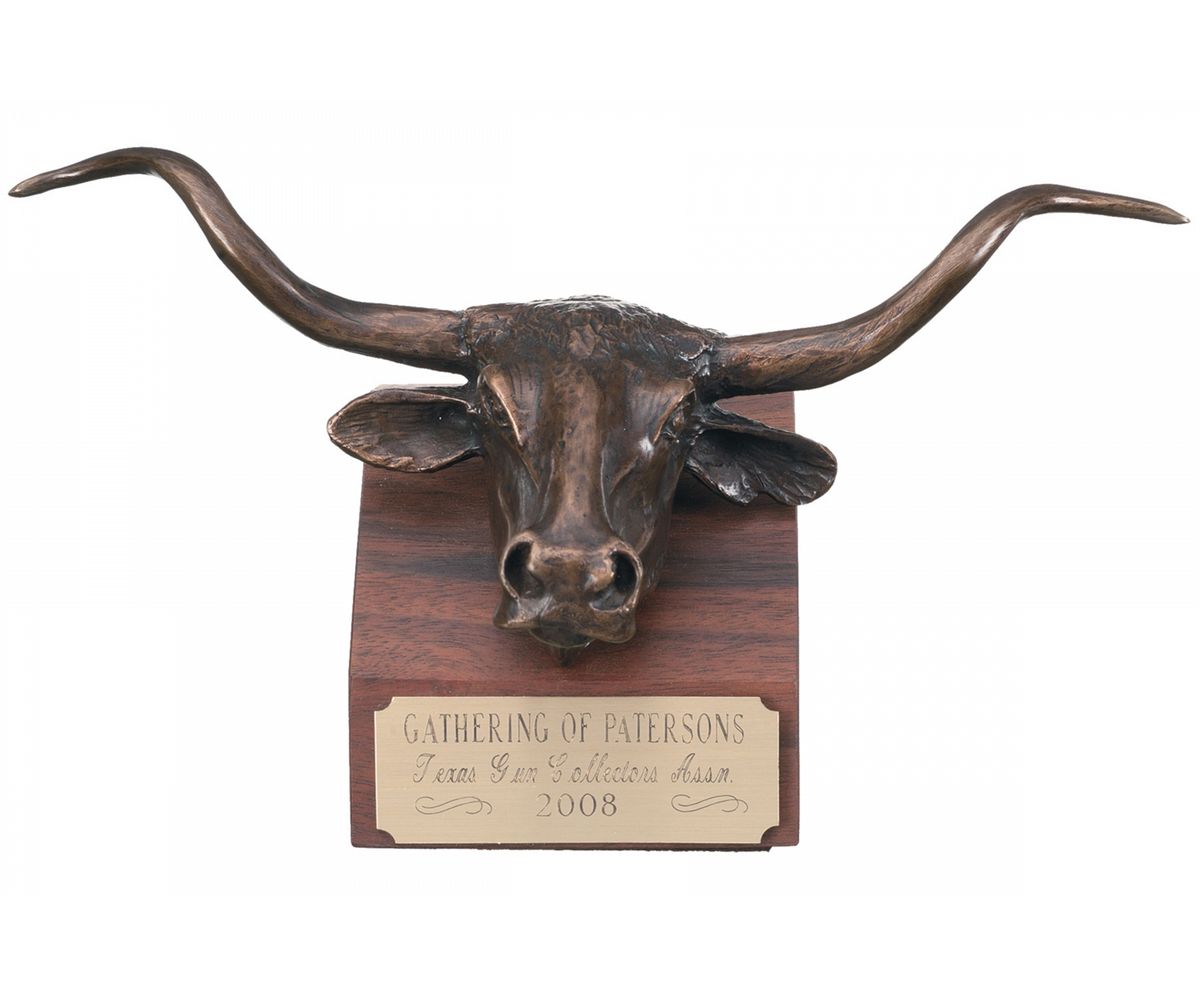 This is the only example of a deluxe Colt Model 1839 Revolving Carbine that was manufactured by Samuel Colt's Paterson, New Jersey, factory circa 1838-1841. The carbine has a highly figured Bird's Eye Maple stock with cheekpiece, checkered wrist and nickel-silver buttplate. The 2 1/2 inch round-back six-shot cylinder is elaborately roll-engraved with three oval panels that depict a hunting scene, a naval battle and a land battle. "COLT'S PATENT/PATENT ARMS MAN'Y/Patterson JERSEY" is boldly stamped between the oval panels and the balance of the cylinder body is roll-engraved with delicate scrollwork. The rifled part-round/part-beveled barrel has a factory loading lever with guide stud on the right side of the lug and a dovetail mounted fixed rear sight and pin front sight. The left side of the barrel lug is roll-stamped "- Patent Arms M'g. Co. Paterson, N.J.-Colt's Pt." with wavy lines and asterisks on either side of the marking. The frame has an iron scroll shaped trigger guard. The serial number "737" is located on all visible parts. Included with the carbine are: (1) unmarked "cross-pump" Model 1839 Paterson flask with two-piece horn body (shown on page 24 of COLT ACCOUTERMENTS by Robin J. Rapley), (2) Brass Paterson rifle capper which features the Rampant Colt, a Paterson revolving rifle and two crossed Paterson revolvers on the lid circled by "PATENT ARMS MANg Co-PATERSON: N.J.-COLTS PATENT" (Rapley C3, Page 56), and (3) Paterson Model 1839 Carbine .52 caliber, round ball bullet mold with three turned wooden handles (Rapley M#5, Page 42). Also included with the carbine is a small bronze Texas Longhorn trophy with a plaque engraved "GATHERING OF PATERSONS/Texas Gun Collectors Assn./2008".