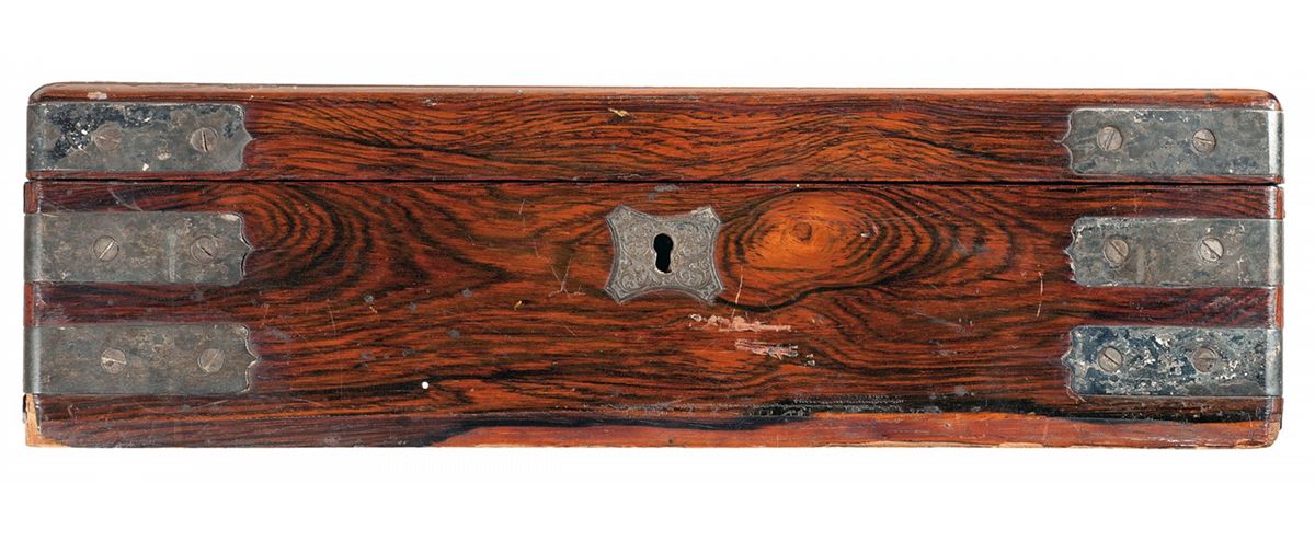 Condition: Fine as period modified, reportedly by the family. The interior lining on the lid is absent. Some of the veneer on the bottom edge as chipped off and there are a couple of minor repairs (veneer reglued). The inside edging, which is made of veneered wood, is absent on one edge. The silver hardware has darkened with age. The lining is beginning to come loose on the upper edges, otherwise is very good plus. A very unique piece of Colt history and probably the only chance one may have to buy a presentation Colt case of this significance!.