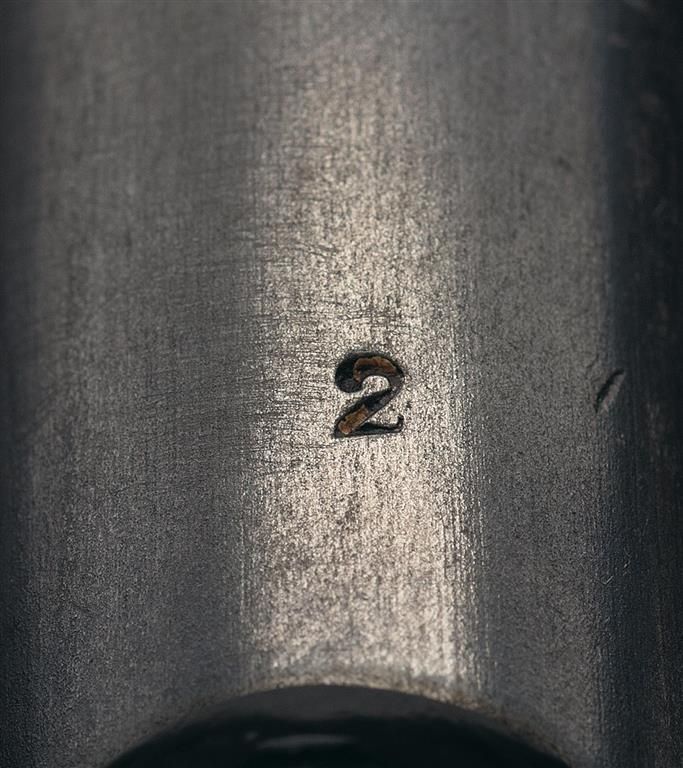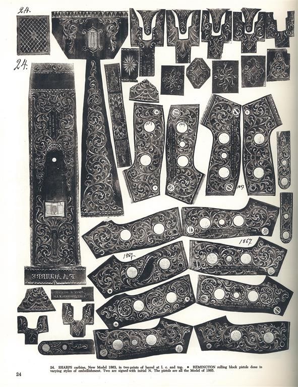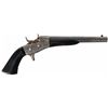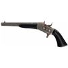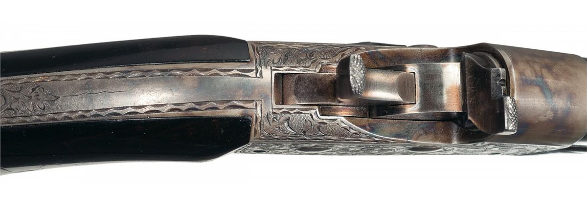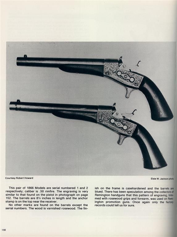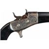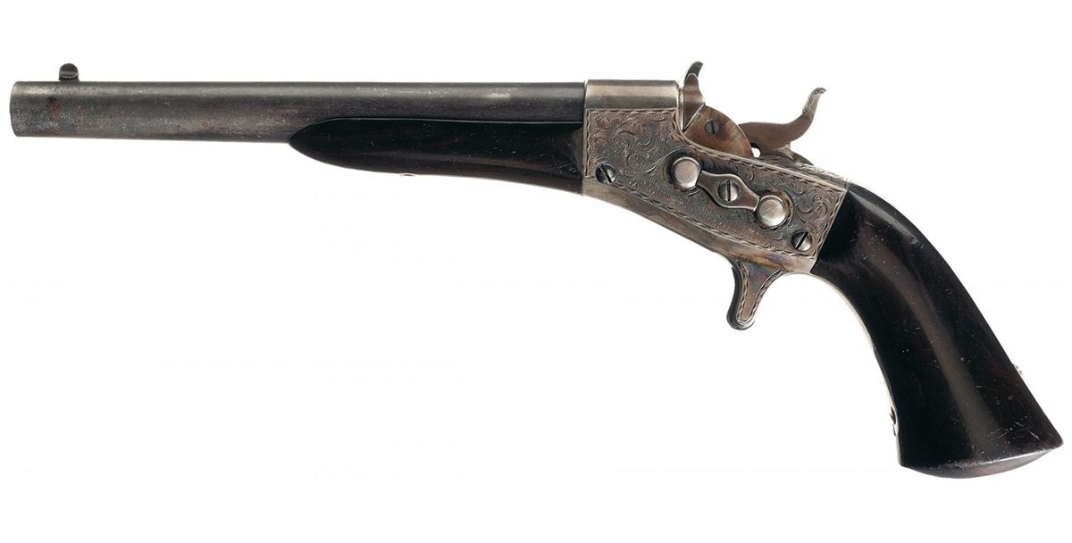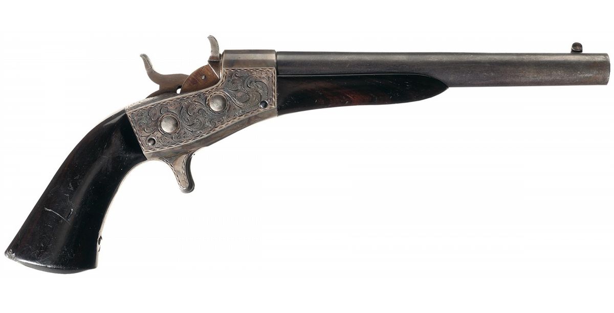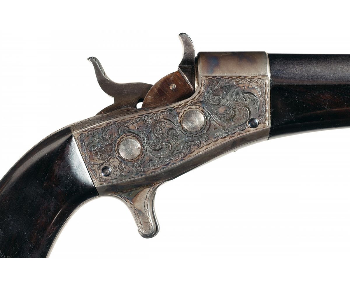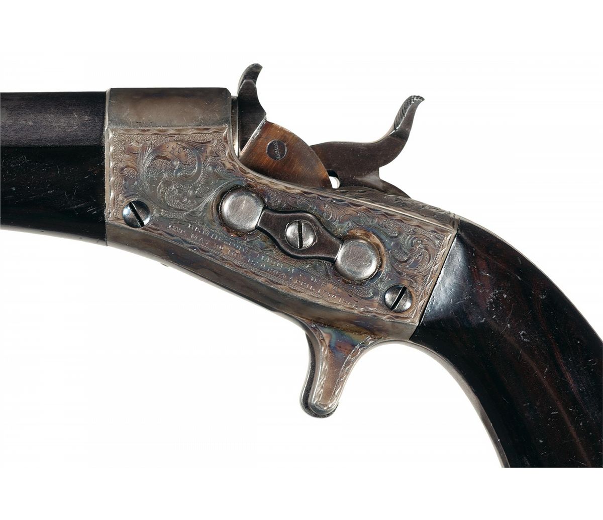 Introduced in 1866, this is an extremely early example of the Remington Model 1865. This pistol is unquestionably engraved by the hand of world renowned Master Engraver L.D. Nimschke. Similar examples of his work on Rolling Block pistols can be seen in his pattern book L.D. Nimschke Firearms Engraver by Wilson on page 24. A fine wavy border is engraved on the sides of the trigger housing, the back strap up to the sides of the hammer, and the side panels of the frame, with the latter being virtually filled with densely cut punch dot backed scroll engraving, additional scroll and punch work around behind the hammer, and a leaf design extending up from the grip screw. Equipped with a set of strongly colored attractively varnished rosewood forearm and grip. Given the early production, high quality engraving and lovely wood, it is quite likely that this arm was intended as a presentation piece, one of the top-rate arms that would be given as gifts to allies of the firm and notable figures in political, diplomatic and military circles whose endorsement could go a long way towards getting an arm adopted by an Army or Navy. Formerly of the Robert Howard Collection, during which time this arm along with #1 were featured on pages 150 and 151 of Landskron's "Remington Rolling Block Pistols". The barrel is fitted with a pinched blade front sight and a notch in the top of the breechblock serves as the rear sight. The top of the barrel at the breech is marked with an anchor, the bottom of the barrel ahead of the forearm is marked with the number "2" and the lower left side of the receiver is marked with the two line address/patent dates. Blue barrel and casehardened remaining parts, and mounted with a smooth rosewood forearm and one-piece grip.
