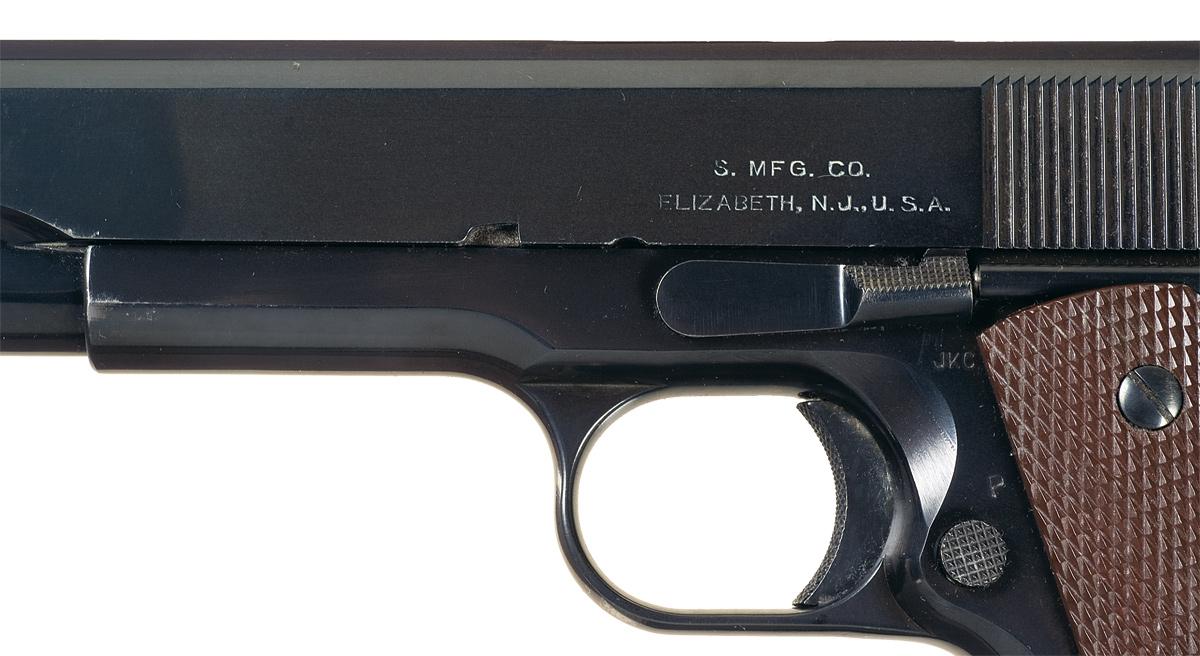 Condition: Excellent plus. The pistol retains 99% of the original high polish Du-Lite finish. Wear is limited to some minor finish loss on the slide at the muzzle and on the forward edges of the frame. The barrel has minor cycling wear on the chamber and a bright bore. The Keyes Fibre stocks are in excellent condition. The Singer markings on the left side of the slide are crisp and deep. The serial number and U.S. markings on the right side of the frame are crisp. The "P" proof marks on the slide and frame and the "JKC" final inspection mark on the frame have correct raised, bright, edges. All three magazines are in excellent condition with at least 95% of the blue finish. This is an exceptional example of a rare Singer M1911A1 Pistol with an interesting documented history. A Singer Model 1911A1 is the key piece in any advanced Model 1911/1911A1 or U.S. martial pistol collection.