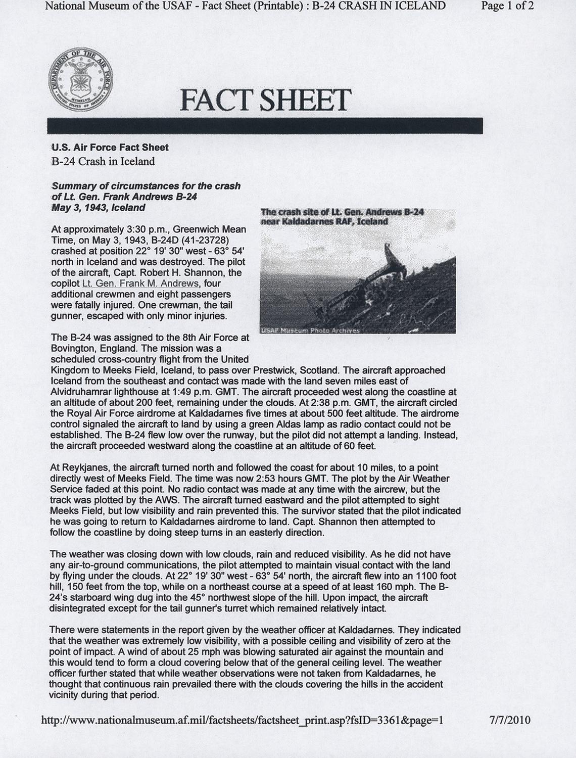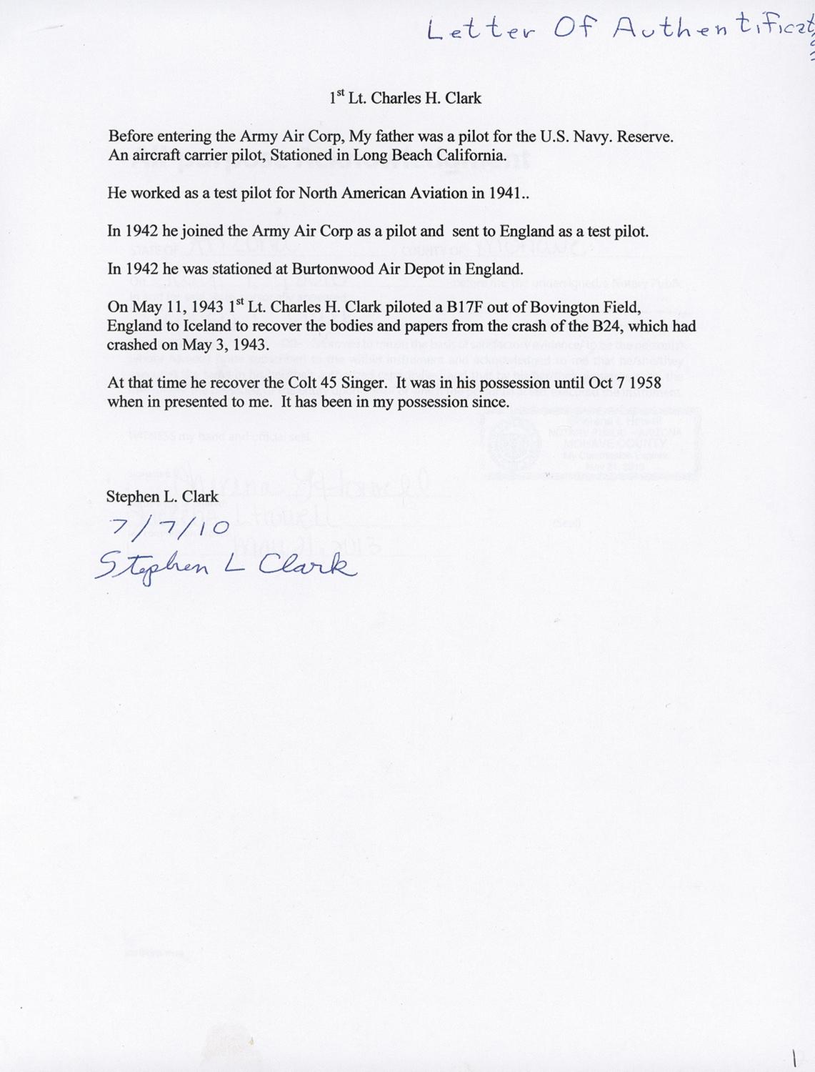 This is an exceptional example of a Model 1911A1 Automatic Pistol that was from the 500 pistols manufactured by the Singer Manufacturing Co., under Educational Order W-ORD-396 in 1940. The 500 Singer pistols were issued primarily to U.S. Army Air Corps squadrons. The pistol has the unique, high gloss, Du-Lite, blue finish found only on Singer M1911A1pistols. The Keyes Fibre stocks are checkered, brown plastic and lack the reinforcing rings around the screw holes and interior strengthening ribs found on later production Keyes stocks. The pistol has a milled trigger with checkered face, short, wide spur hammer and checkered slide stop, safety lock and main spring housing. The left side of the slide is roll-stamped: "S. MFG. CO./ELIZABETH, N.J.,U.S.A." in two lines. The right side of the frame is roll-stamped: "UNITED STATES PROPERTY/M1911 A1 U.S.ARMY". The serial number: "NoS800221" stamped below the property mark. The serial numbers show the slight misalignment that is typical of Singer M1911A1 pistols. The left side of the frame is stamped with the "JKC" final inspection mark of Colonel John K. Clement Commander of the New York Ordnance District. A "P" proof mark is stamped on the left side of the frame above the magazine release, on the top of the slide between the ejection port and the front sight (the "P" faces left) and on the left side of the barrel lug. The barrel has a full blue finish and the only marking is the "P" proof mark. The pistol is complete with three magazines with high polish, full blue finish and over-size floor-plate pins. This pistol is accompanied by a notarized letter from the consignor. The letter explains how the consignors father, 1 st Lt. Charles H. Clark, was a pilot in the U.S. Air Corps during WWII. Prior to his military service, Lt. Clark was a pilot for the U.S. Navy Reserve stationed on an aircraft carrier in Long Beach, California. He worked as a test pilot for North American Aviation in 1941, joined the Army Air Corps in 1942 stationed at Burtonwood Air Depot in England. On May 11, 1943 he piloted a B17F out of Bovington Field, England to Iceland to recover bodies and papers from the crash of a B24 which crashed on May 3, 1943. In the crash the pilot, co-pilot, 4 crewmen and 8 passengers were killed, the only survivor was the tail gunner, who escaped with only minor injuries. Among the recovered items by Lt. Clark was this Singer pistol which had been in his possession until October 7, 1958 when it was passed on to the consignor who has owned it since. Also with the pistol are 4 photographs of Lt. Clark, a section of the periodical "Take Off". North American Aviation Inc. of Texas, September 11, 1941 with an article about Clark, a copy of an individual flight record of 1st Lt. Clark for the month of May (year not recorded, writer assumes 1943, the month of the recovery) and a copy of an internet fact sheet with the summary of the circumstances of the crash of the on B-24 May 3, 1943 in Iceland.