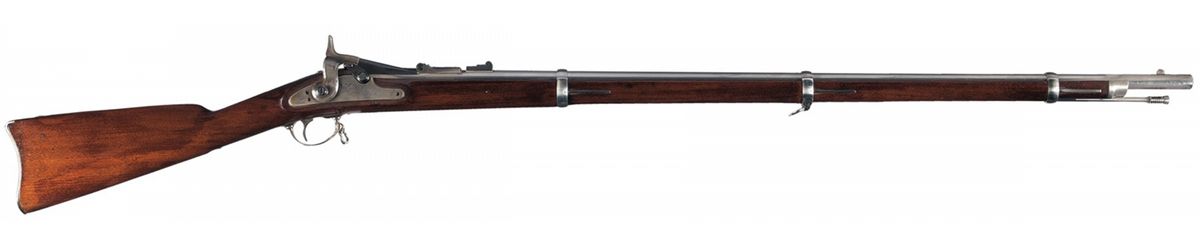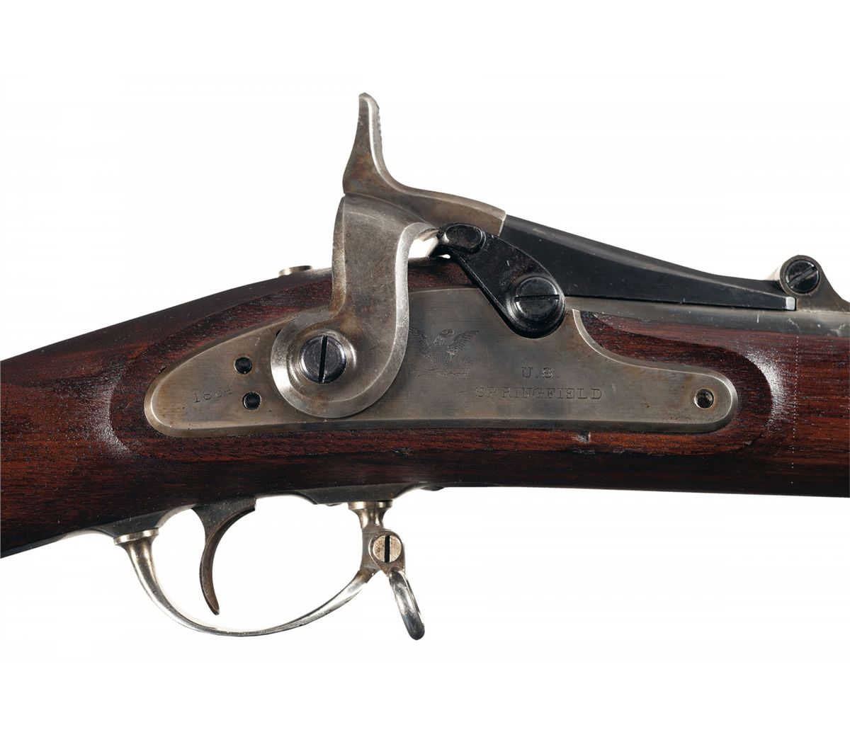 This is an exceptional example of a U.S. Springfield Armory Second Model Allin Conversion rifle as produced circa 1866. There were 25,000 produced at Springfield. These rifles were the transition from using a Civil War muzzle loader to true breech loaders. The casehardened lock plate is dated "1864" behind the hammer and is marked with the eagle and shield followed by "U.S./SPRINGFIELD" in two lines ahead of it. The top of the breechblock is stamped "1866" above an eagle head. There is a "C" stamped on the left side of the barrel below the breechblock. The buttplate is marked "US" on the top tang and all three barrel bands are marked with the letter "U". There is a fixed front sight and a two leaf, fold down rear sight. The stock is marked with a boxed "HSB" script cartouche on the left side and an "L" behind the lower trigger guard tang. The barrel and furniture have the standard Springfield "National Armory Bright" finish. The hammer and lock plate have a color casehardened finish and the breechblock has a black, oil-quenched finish. With a cleaning rod.
