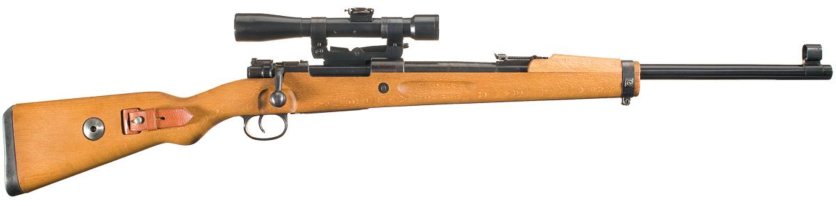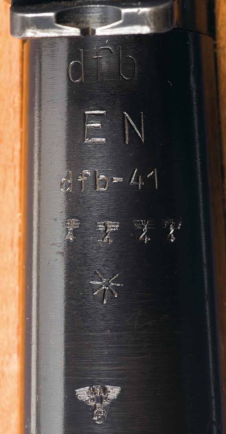 This is a beautiful example of a prototype "K98" style heavy barreled sniper rifle "Serial Number 3". This rifle was manufactured using a wartime K98 "bcd" marked receiver, original WWII German long side rail scope base and mount. These long side rail sniper rifles were probably the most robust of the various German sniper rifles produced during WWII which could withstand the rigors of wartime use while still being the easiest to manufacture in large quantities. The top of the receiver has the wartime code marking of "bcd/4" for the Gustloff-Werkes in Weimar with a single Eagle 1 proof on the right side of the receiver, with only the serial number "3" on the left side. The base has the correct large dovetail on top with the three large retaining screws, corresponding lock screws and two taper pins on the side with only a single small Eagle 359 Waffenamt proof. The mount is the correct wartime version with the large locking lever on the left side that is serial numbered "3", which is complete with the stamped sheet metal scope bands. The two most intriguing features of this rifle is that it is fitted with a heavy target type sniper barrel with a new factory (not cut down) half length hardwood stock and handguard. The stock and handguard are both stamped with serial number "3" and the stock has the bolt takedown washer mid-way in the butt area with the standard wartime cupped buttplate. This style of stock is very similar to many of the current match or target type stocks used today. The shorter style stock and handguards did away with all the front bedding problems and additional parts associated with the full length stock. The fore stock extends to approximately 5 inches in front of the rear sight base with the corresponding handguard approximately 5 3/4 inches in length and goes from the middle of the rear sight base to the end of the fore stock. Both fore stock and handguard are retained with a VZ24 style barrel band with the side mounted sling swivel. This style of barrel band provided the necessary tension to the fore stock and handguard to dampen barrel vibrations. The barrel is very similar in size to the early MG-34 barrel diameter and configuration, that is approximately 23 inch long and has the standard four lands and groove rifling. The outside diameter measures approximately 1 inch at the front of the receiver, tapers down to approximately 7/8 at the rear sight base and then tapers down to approximately 3/4 of an inch at the muzzle. The rear sight base is a pre-war Mauser style sporting or commercial style base with the short tangent with the locking screw in front of the base and leaf correctly graduated from 100-1000 meters. The barrel is fitted with a machined prototype 98K style front sight that consists of a machined front sight base mounted on a semi-circle round barrel band that has been soldiered onto the barrel with a sheet metal front sight cover. The top of the barrel behind the rear sight base is correctly marked "dfb/EN/dfb-41" with four "Eagle 4" proof marks over a small asterisk style proof over a single WWII German eagle firing proof. The right side of the barrel is also marked with "S/1454" over the matching serial number "3". The "dfb" markings are the subcontractor code for the Gustloff Co. Waffenfabrik in Suhl Germany. As noted the rifle is fitted with an original long side rail type scope base and matching mount which has been fitted with an early pre-war C.P. Goerz sniper scope. The Goerz factory was noted for producing many WWI sniper scopes for the GEW series of rifles and this one has been modified by adding a recoil ring in front of the windage base that would have corresponded to the later long side rail scope that were all fitted with this same style of recoil ring. The top of the scope is only marked "C.P.GOERZ/4X". It is fitted with a sniper style elevation dial that has the range markings from 100-800 meters with the standard German 3-post reticule pattern. The rifle is fitted with a standard late war stamped trigger guard that is marked with the wartime code of "qnw" with a single trigger. The bolt is also a late war style without the guide rib and the enlarged gas holes with a correct milled sniper style safety lever. The bolt and corresponding cocking assembly all correctly match serial number "3".