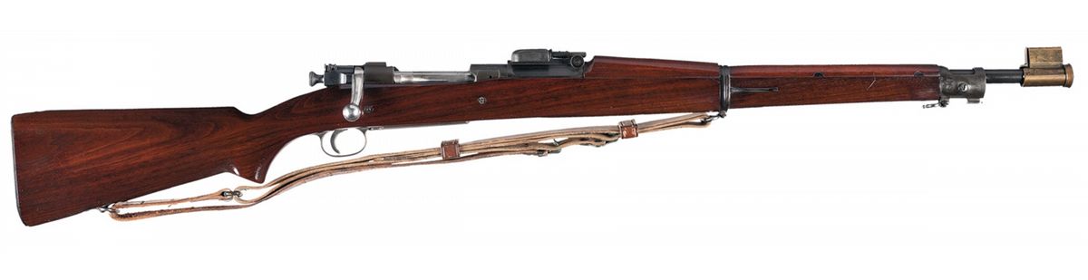 This is an excellent example of an extremely well documented U.S. M1903A1 National Match Rifle that has a fixed front sight and a ladder rear sight with 2,850 yard notch. The barrel has a star gauge mark on the muzzle and is marked "S A/flaming bomb/3-37". The bright polished bolt is numbered to the gun and is marked "N.S." on the top flat at the base of the bolt knob. Mounted on a smooth walnut pistol grip stock with boxed "S.A./S.P.G." cartouche, circled "P" proof, two reinforcing bolts, marked with the serial number and drawing number between the rear sling swivel and grip cap area, and a checkered steel buttplate with trapdoor (empty). With a leather claw sling, brass muzzle/sight cover marked "P.J.O'HARE/SOUTHORANGE,N.J./MADE IN U.S.", a rear sight cover marked the same, a framed test target and star gauge report, and a framed order approval, shipping ticket and shipping label.