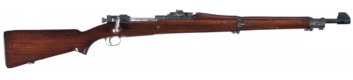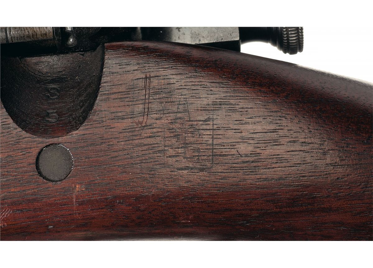 This is an exceptional example of a well documented Springfield M1903 National Match Rifle. Fixed front sight, ladder rear sight with 2,850 yard notch, marked on the muzzle with a star and the barrel is marked "S A/flaming bomb/5-36". The bright polished bolt is electropenciled to match the gun and is marked "N.S." on the top flat at the base of the knob. Mounted on a smooth walnut pistol grip stock with boxed "S.A./S.P.G." cartouche, circled "P" cartouche, sling swivels and a checkered steel buttplate with trapdoor (empty). With a model 1921 muzzle/front sight cover, a small "P.J.O'HARE/N.J." marked rear sight cover and a large frame containing order approval letter, star gauge record, shipping tickets and a "Railway Express Agency" shipping receipt. The approval letter and shipping tickets show that a Rock Island Arsenal 1903 serial number 20,995 was exchanged for the current receiver and was barreled with a National Match barrel.