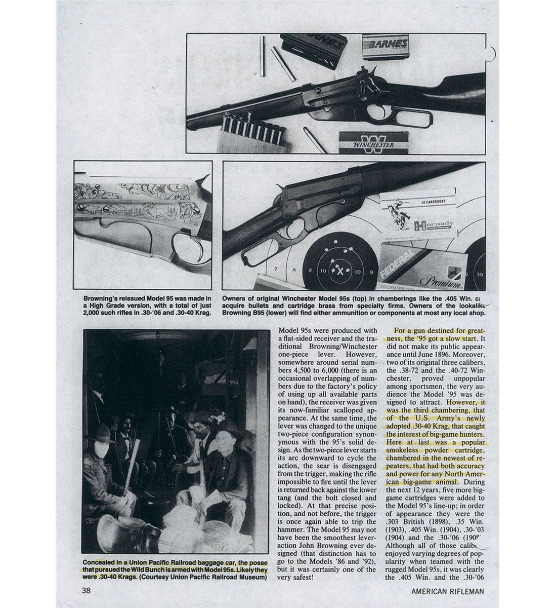 Manufactured in 1921, this is an exceptional example of a Winchester Model 1895 Saddle Ring Carbine. Contoured side frame with the saddle ring and stud mounted on the left side. The left side of the receiver is marked with the standard two line address/patent dates and the top of the receiver ring is marked with the Winchester oval proof over ".30/ARMY". The upper tang is marked "MODEL 1895/-WINCHESTER-/TRADE MARK REG. U.S. PAT. OFF & FGN." and the serial number is marked on the lower tang behind the trigger with a "B" at the end of the tang. Ramped blade front sight and folding ladder rear sight graduated to 1,800 yards. Mounted with a smooth military style forearm with grasping groove and handguard secured by a barrel band and straight grip stock with a steel carbine buttplate with compartment containing an original pull though bore cleaner. The carbine comes with the original hanging tag "Information and Instructions", a copy of the book "Winchester An American Legend" by R.L. Wilson, a copy of the 1921 Winchester catalog #82 and a nicely frame and matted Winchester advertising print of a cowboy on horseback with a Model 1895 and a bear. The frame is 24 1/2 inches by 31 inches.
