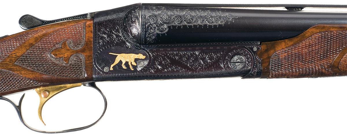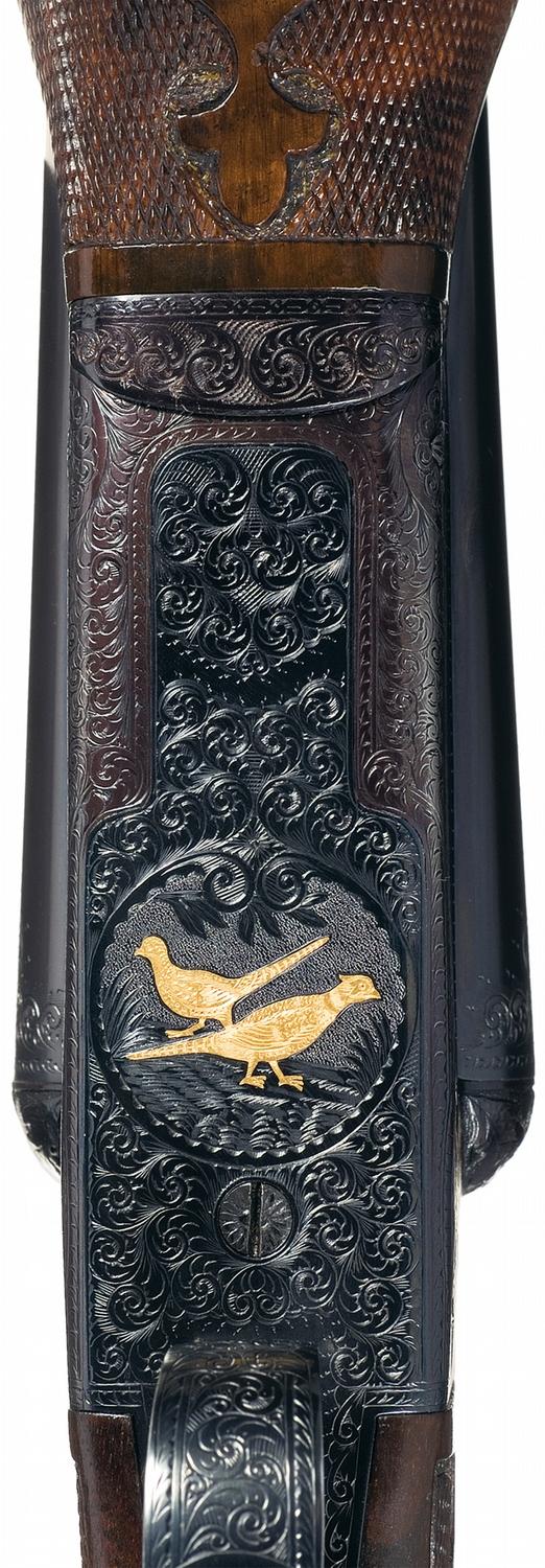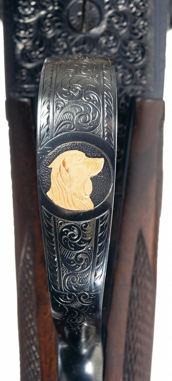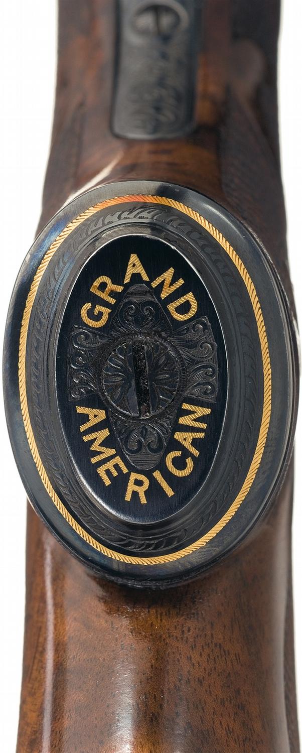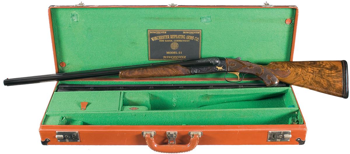 This is an example of a cased Model 21 Winchester, two-barrel Grand American marked shotgun. These Grand American shotguns were the "Piece De Resistance" of the Winchester Model 21's, with each one of them being custom ordered and embellished. This is a mid-production 12 gauge Grand American shotgun (SN27456) that would have originally come out of the custom shop, that could easily be documented via a factory letter (we do not have one at this time, so can not verify). This shotgun has the original Winchester hand polished, high luster blue finish with presentation grade walnut stock and forend with hand cut "Fleur-de-Lies" checkering. The parts on all model 21 shotguns were hand fitted and finished giving them the smoothest action with the best wood to metal fit of any Winchester shotgun produced. As noted, this is a factory cased "two-barrel" set with full factory engraving on the receiver and "five" Winchester factory gold inlays. Both barrels are marked on the underside, "Winchester Proof Steel" with the circled "WP" factory proofmark. Barrel set No. 1 is 30 inches long and is marked on the underside (FULL & FULL) 12 GAUGE/ 2 3/4 inch chambers. Barrel set No. 2 is 28 inches long and is marked on the underside (MOD & IMP CYL) 2 3/4 inch chambers. The shotgun is lavishly engraved with 98% of the overall surfaces of the receiver being engraved in a very nice delicate, almost English style scroll engraving with geometric designs and engraved borders, with the breech ends of the barrel also receiving a duplicate engraved pattern. As noted this specific shotgun has "five" exceptionally well done, Winchester factory gold inlays with a game scene background, and outstanding detail on the actual inlays. The inlays are as follows: the inlay on the right side depicts a Labrador Retriever on point, with the inlay on the left side showing an Irish Setter in a standing position, and the underside of the receiver showing a pair of ring-necked pheasant (rooster and hen) in a field scene. The gold inlay on the trigger guard bow depicts the bust of an Irish Setter. The Gold inlays are all surrounded by a oval or round geometric border pattern. As noted, the shotgun is a Grand American version with a gold plated single trigger, matted, raised ventilated rib with two bead sights, that has been engraved on top of the rib, "CUSTOM BUILT BY WINCHESTER". The water table of the receiver is correctly marked "MADE IN U.S.A./MODEL 21/WINCHESTER REPEATING ARMS CO. NEW HAVEN CONN.", with the internal parts having an engine turned burnished finish. As noted, the engraving that covers the shotgun is masterfully done and fully complements the five gold inlays. The inlays themselves are like the engraving, masterfully laid out and executed. The shotgun is fitted with a set of presentation or AAA grade American honey colored walnut stock and forend, both of which are meticulously hand-checkered in "Fleur-de-Lies" with hand stippling or shading around the Fleur's. The forend has a black ebony insert in the tip, the stock itself has an engraved steel grip cap that also has a fine gold line border around the edge with the center section engraved, "GRAND AMERICAN". The lower section of the stock has a blank small brass presentation plaque and the butt is fitted with an English pattern rubber recoil pad. Length of pull approximately 14 3/8". As noted the shotgun has the original deep high polished blued factory finish on all the metal surfaces except for those inside the action and lug areas that have been left in the bright with the engine burnished swirls. This shotgun is housed in a contemporary, "Herkert & Meisel" custom built carrying case with green felt lining. The case has four compartments; two to house each one of the barrels and forend, one to house the shotgun receiver/stock and a single compartment for accessories. A 7 X5 inch non-original Winchester factory style label has been fixed to the inside of the lid.