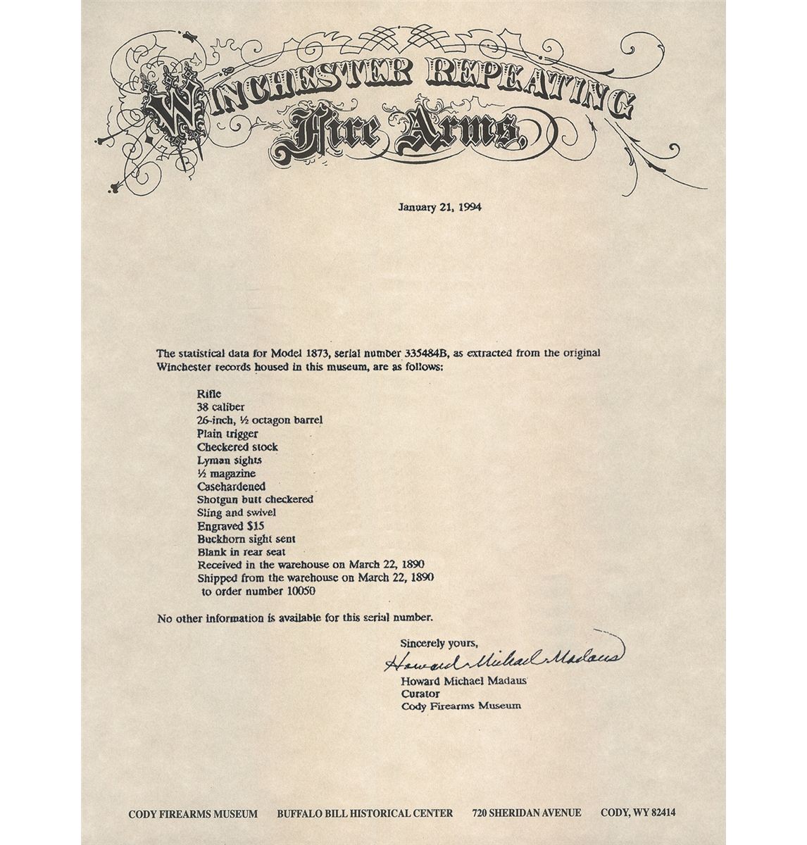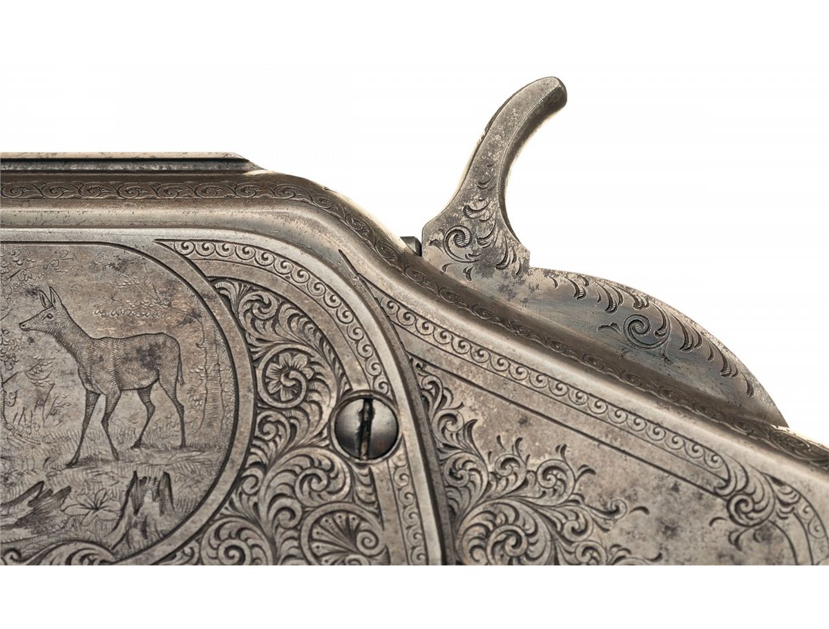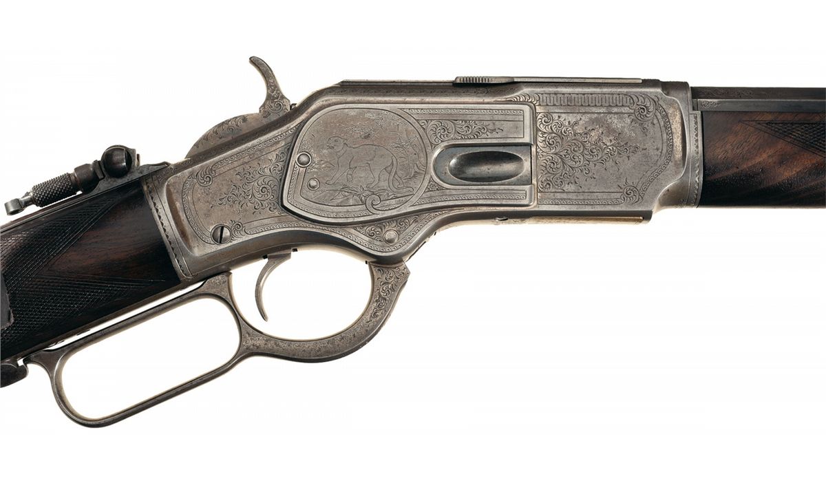 This is an extremely rare and extremely well documented engraved like "1 of 1000" which is featured on page 137 of the book "The Story of the Winchester 1 of 1000 and 1 of 100" by Lewis as well as page 158 of "Winchester Engraving" by Wilson. This rare engraved like a "1 of 1000" is also highly embellished and signed by Winchester Master Engraver John Ulrich. The accompanying factory letter documents that this rifle was shipped from the Winchester warehouse on March 22, 1890, and had the following features: 38 caliber, 26-inch, half-octagon barrel, plain trigger, checkered stock, Lyman sights, 1/2 magazine, casehardened receiver, checkered shotgun buttplate, sling and swivel, $15 engraving, blank in rear sight dovetail and "Buckhorn rear sight sent". The rifle has a blue barrel and color casehardened forearm cap, receiver, hammer, lever and checkered shotgun buttplate. The stock and forearm are highly figured "fancy grain" walnut with a "piano finish". The stock wrist and forearm have Winchester "Style H" checkering. The half-round/half-octagon barrel has a Lyman No. 5 Folding Combination Front Sight with ivory post and a dovetail mounted sporting style buckhorn rear sight. A folding combination rear sight is mounted on the receiver tang. Sling swivels are mounted on the forearm cap and underside of the stock. The unusual and likewise ultra rare "$15 engraving" is executed on the barrel muzzle and top flats, forearm cap, dust cover, side plates, cartridge elevator, bottom and sides of the receiver, upper and lower tang, sides and bottom of the loading lever, sides of the hammer and heel of the buttplate. The engraving appears to be at least the equivalent (quite possibly the same) of the Winchester No. 6 Engraving illustrated in the 1897 edition of Winchester "HIGHLY FINISHED ARMS" and features two highly detailed game scenes: a detailed panther on the right side plate and two deer on the left side plate. The balance of the decoration includes scroll border and ribbon engraving. The bottom tang carries the signature "J. ULRICH". The top of the barrel is roll-stamped with the two-line legend "WINCHESTER'S REPEATING ARMS. NEW HAVEN. CONN. U.S.A./-KING'S IMPROVEMENT PATENTED.MARCH 29.1866. OCTOBER 16. 1860.-" ahead of the rear sight. The caliber "38 W.C.F." is roll-stamped in an engraved panel just ahead of the receiver. "38 CAL" is roll-stamped in script letters on the cartridge elevator surrounded by scroll-work. The serial number "335484B" is located in an engraved banner on the lower receiver tang behind the lever latch.