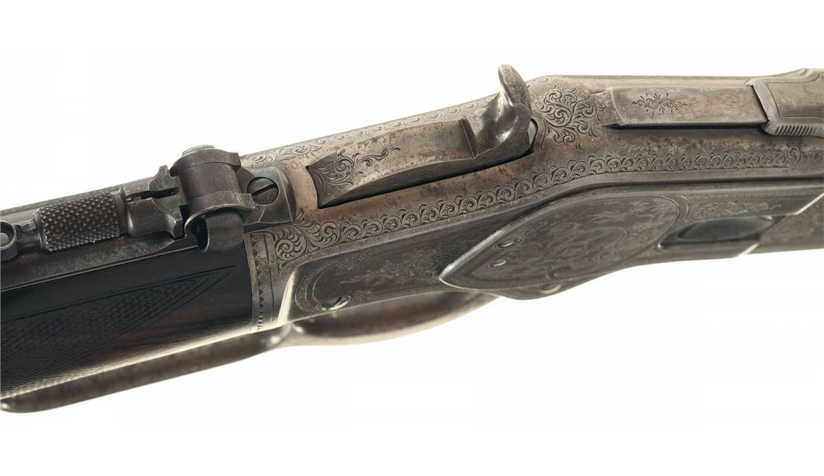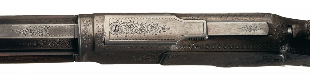 Fine overall. The rifle retains 60% of the original blue finish with traces of the original casehardened finish. The loading gate retains 40% of the niter blue finish. The case colors on the forearm cap, receiver, lever, hammer, dust cover and buttplate have faded to a silver-gray patina with darker colors in protected areas and silvered finish on contact points. The surfaces of the forearm cap, receiver, hammer and lever are smooth with no pitting. The buttplate has light pitting and contact wear. The fine engraving remains crisp and well defined. The stock and forearm are both in very good condition. The checkered panels have some handling wear and the high polish piano finish has dulled with age. The highly figured fancy grain 4x walnut has only a few very minor handling marks. This is a excellent and equally rare full coverage engraved like "1 of 1000" rifle that would be nearly impossible to find another with this level of embellishment and with such a pedigree.