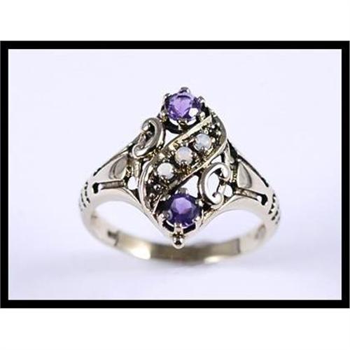 <tr><td>Materials:9K yellow gold with 2 round cut amethysts and 3 round opals </td></tr>