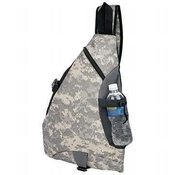 Extreme Pak 600D Poly Digital Camo Sling Backpack **|**|** Features zippered main compartment; zippered front pocket; pocket with hook and loop fastener on shoulder strap; mesh pocket; and hand strap. Measures 12-1/2" x 19-1/2" x 5".