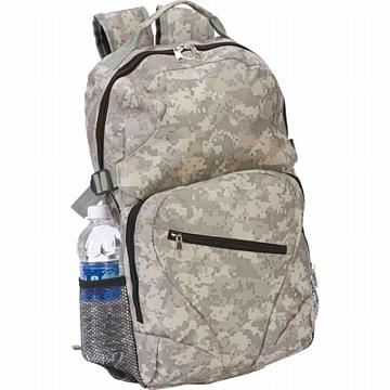 Extreme Pak Digital Camo Water-Resistant Backpack **|**|** Features zippered main compartment, 2 zippered exterior compartments, 2 mesh side pockets, padded back, hand strap, and padded adjustable shoulder straps. Measures 14" x 19" x 6-1/2".