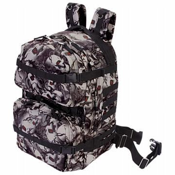 Extreme Pak Red-Eye Skull Camo Water-Resistant 19" Back **|**|** Carry along extra room and versatility the next time you travel with this backpack featuring multiple zippered exterior compartments, a see-through mesh interior compartment, padded shoulder straps, adjustable waist strap, and stitched webbing zipper pulls. Measures 14" x 19" x 8".