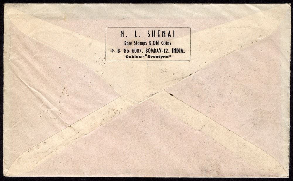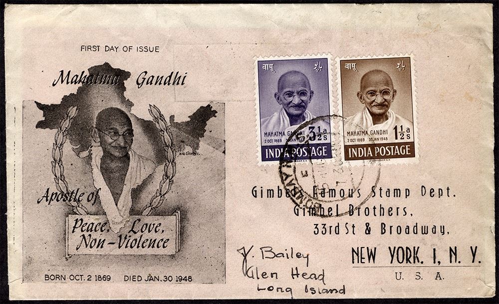 1948, FDC(Private Issue),2V., 1 1/2a, 3 1/2as,Bombay to USA,Cancellation1948 AUG15, Rare as Gandhi Portrait on Map of INDIA, Pakistan and Bangladesh, Slogan Apostle of Peace, Love Non-Violence, Excellent Condition,Rare.